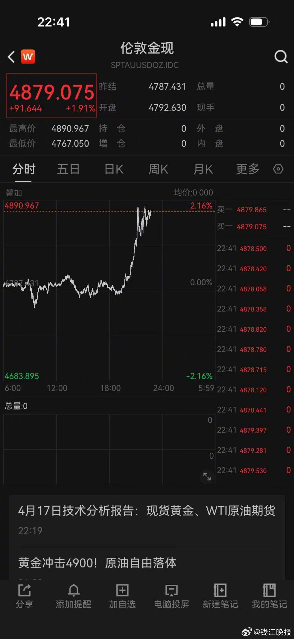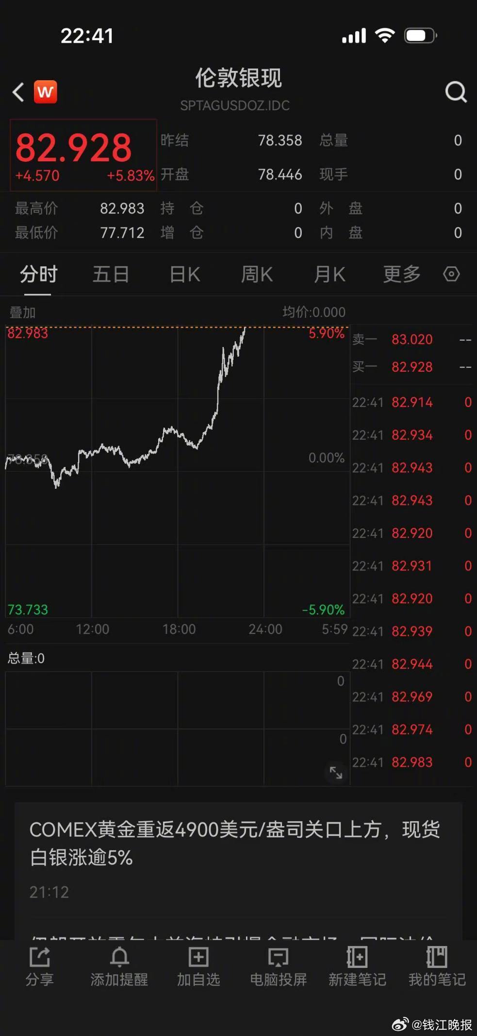 #霍尔木兹海峡开放贵金属大涨#【刚刚,贵金属大涨!】#霍尔木兹海峡开放黄金白银集体大涨# 刚刚,黄金白银集体大涨。截至发稿时,受霍尔木兹海峡重新开通的消息影响,现货黄金大涨超1.91%,暂报4879美元/盎司附近。现货白银大涨5.83%,接近83美元/盎司。#霍尔木兹海峡开放# (潮新闻 记者 吴恩慧)