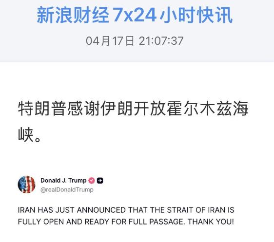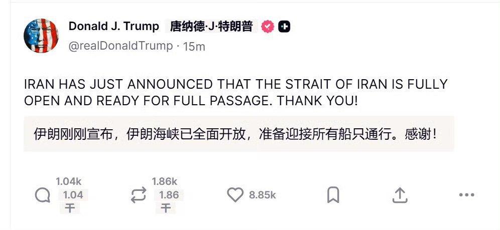 突然被搞懵了,美伊这是亲如一家人了吗? 4月17日,特朗普突然发贴称:感谢伊朗开放霍尔木兹海峡。他说伊朗刚宣布,霍尔木兹海峡已经完全开放,可以全面通行,并表示感谢。这么看的话,伊朗赢了、美国赢了,双方皆大欢喜。只留给海湾国家一地鸡毛,把美国当盟友又是出钱出基地,然后被伊朗炸个过瘾,没想到现在美伊居然亲发一家都开始发表感言了。