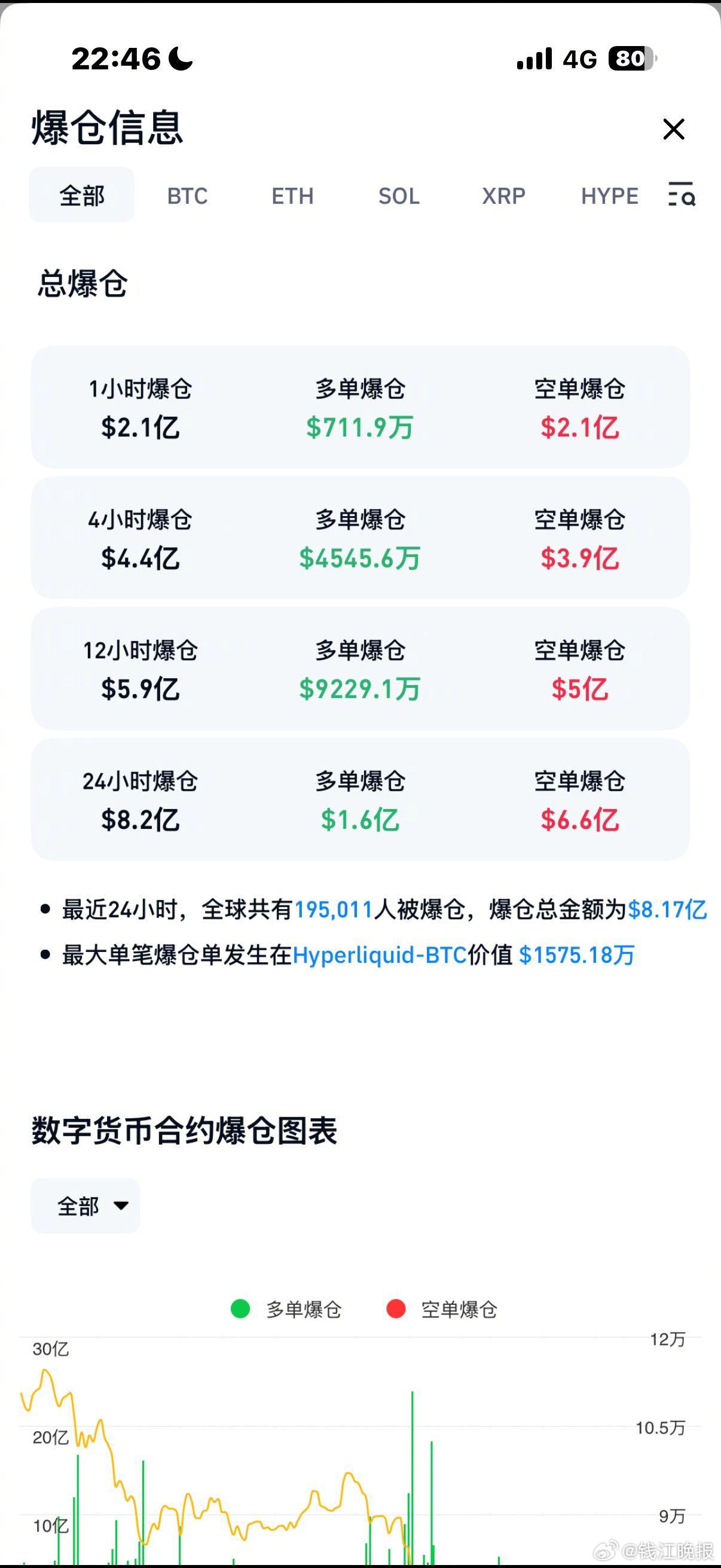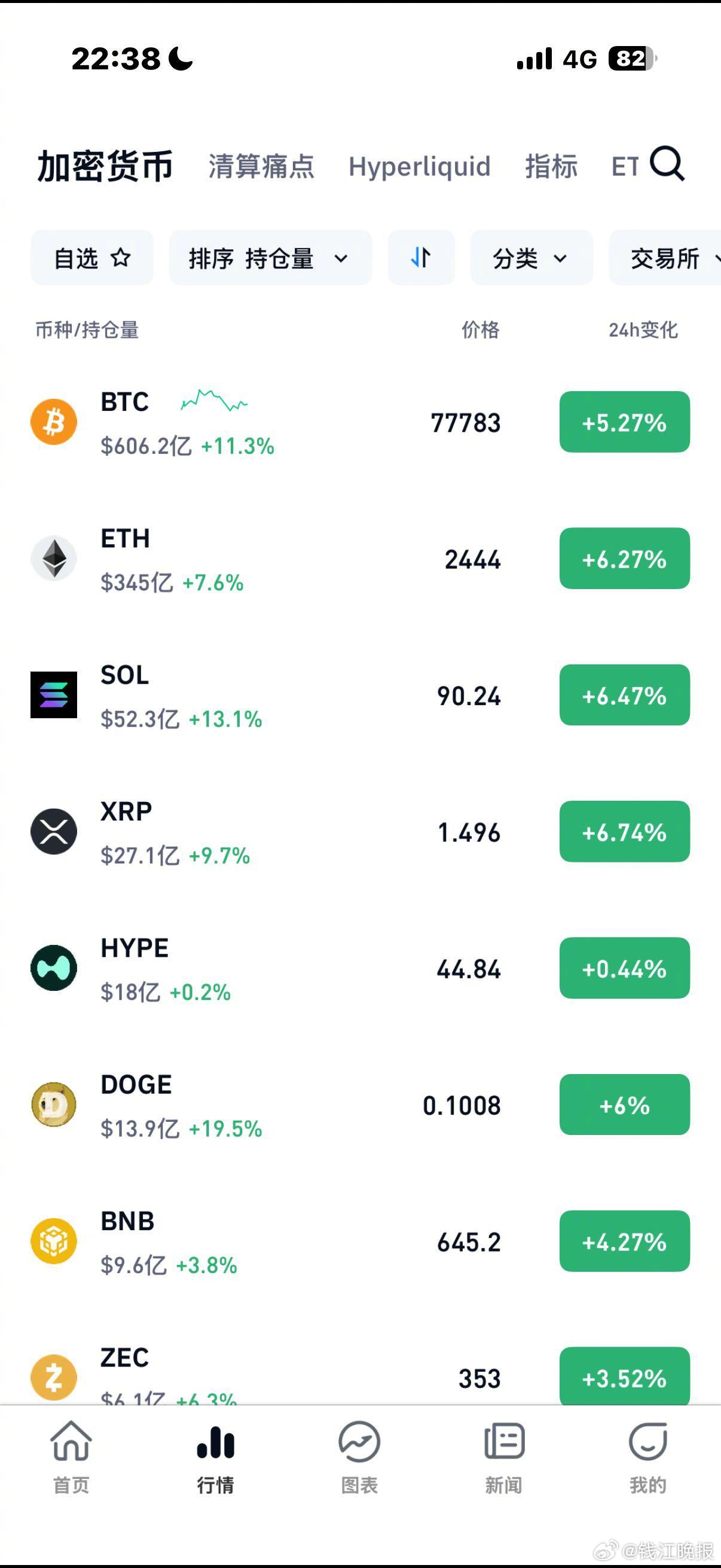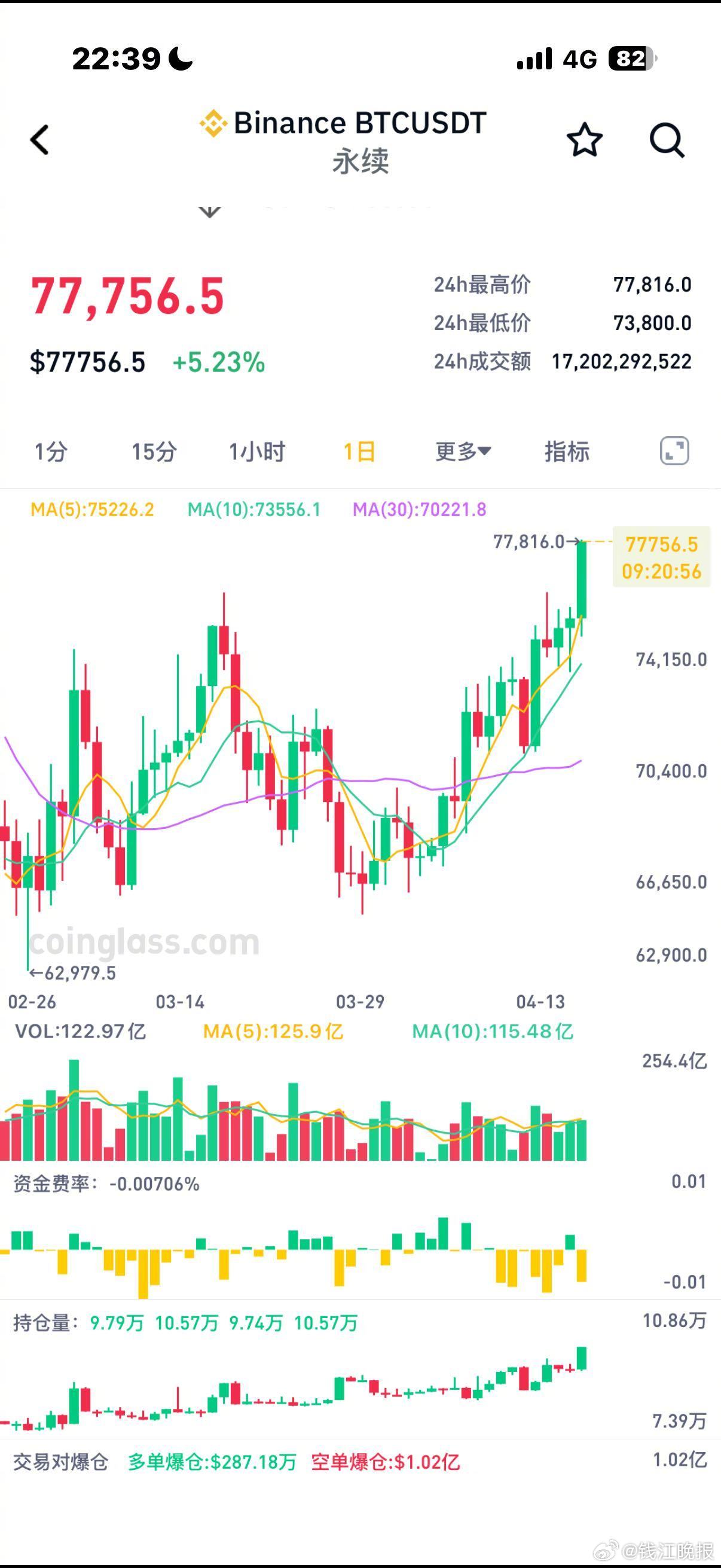 #比特币大涨创近两个月新高#【霍尔木兹海峡重新开通,比特币创近两个月新高】#比特币大涨19.5万人爆仓# 霍尔木兹海峡重新开通的消息,让虚拟货币市场涨声一片,比特币创出2月3日以来的新高。#霍尔木兹海峡开放# 比特币24小时上涨5.57%,目前报77970美元。以太坊涨6.3%,报2445美元,也创出近两个月以来新高。狗狗币涨5.9%,SOL币涨6.25%。比特币大涨也让爆仓者激增,数据显示,过去24小时,有19.5万人爆仓,爆仓金额高达8.17亿美元,其中多头爆仓1.6亿美元,空头爆仓6.6亿美元。(潮新闻 记者 张云山)