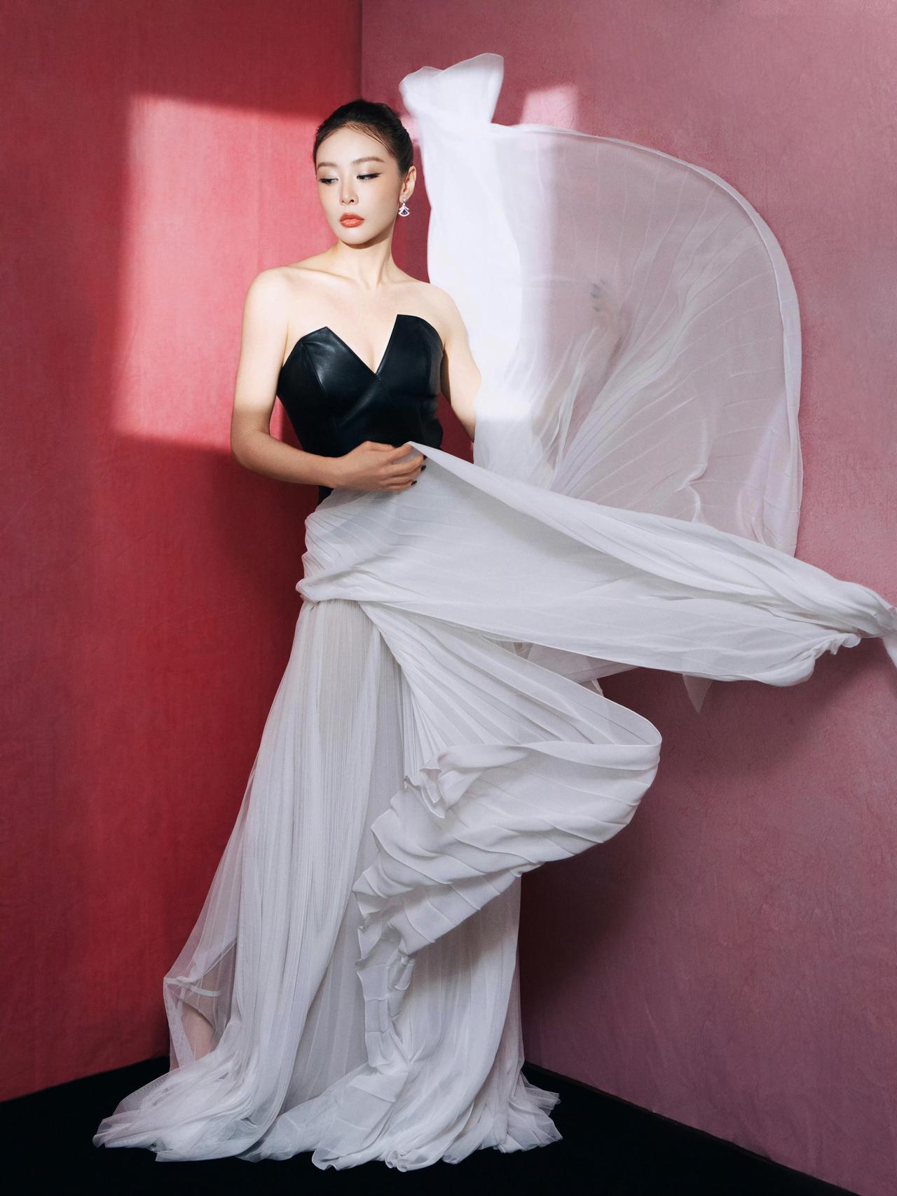 以黑的利落,衬白的飘逸,在红墙与光影间,定格刚柔并济的瞬间。皮革的冷硬碰撞纱裙的柔婉,每一帧都藏着不被束缚的优雅张力。