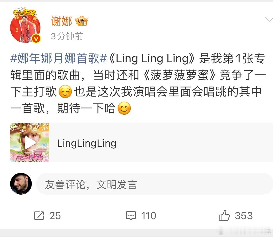 谢娜要唱跳LingLingLing谢娜用来竞争菠萝菠萝蜜的歌是我第1张专辑里面的歌曲,当时还和《菠萝菠萝蜜》竞争了一下主打歌☺️也是这次我演唱会里面会唱跳的其中一首歌,期待一下哈😊