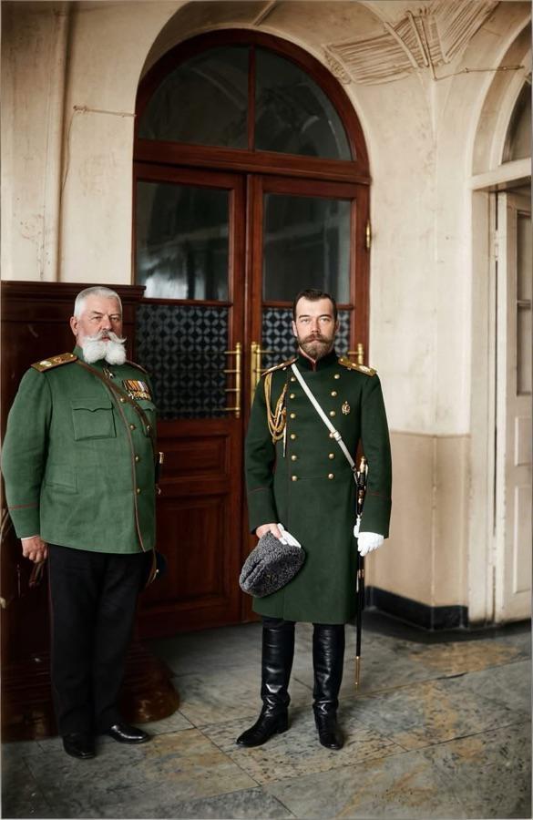 第一次世界大战时期,末代沙皇尼古拉二世与一位俄军高级将领合影!大家认得出该沙俄将领是谁不?会不会是阿纳托利·斯特塞尔或帕维尔·波托茨基? 尼古拉二世是沙俄最后一位皇帝,于1894年登基,直至1917年俄国革命期间被迫退位。照片中,他身着全套军装,脚蹬高筒靴,手持军帽,这一行头正是他自1915年亲自接管军队指挥权后,频繁赴军队最高统帅部办公时的典型形象!老照片