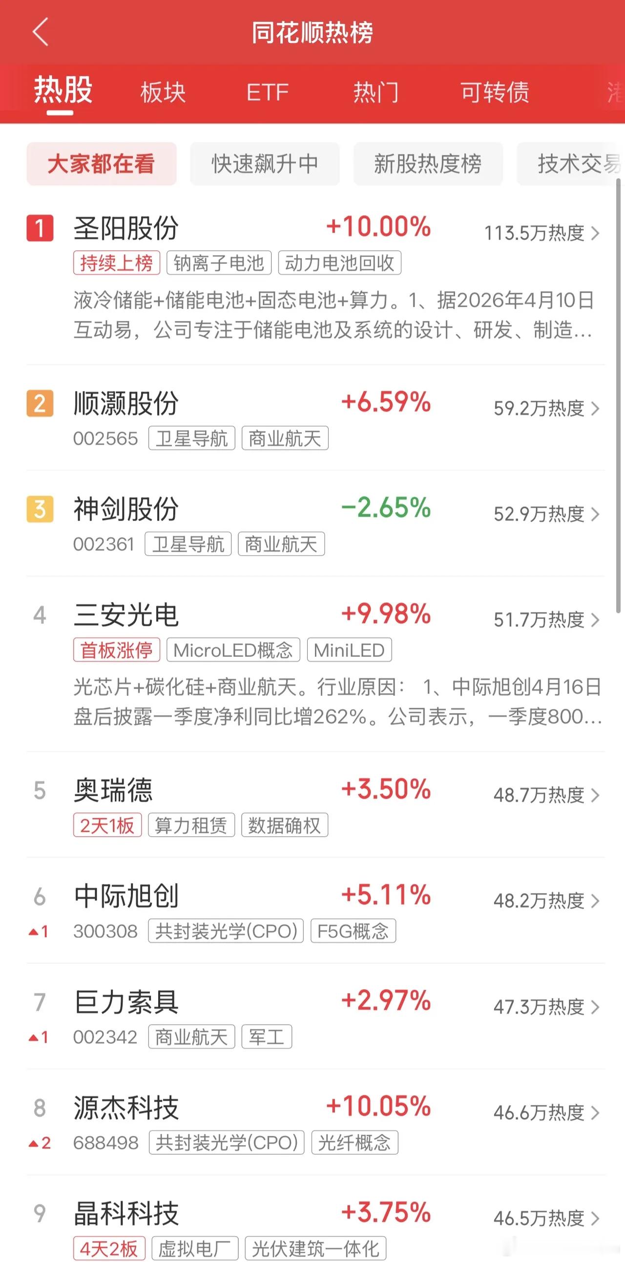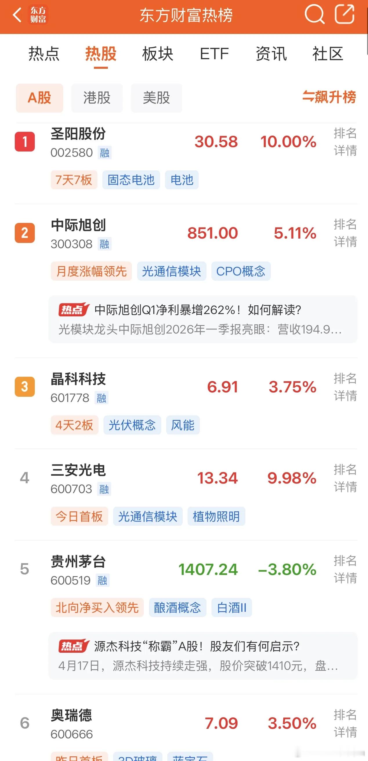 2026年4月17日,各大股吧前十热股:淘股吧: 1.凯华材料 2.圣阳股份 3.博云新材 4.东方财富 5.沃格光电 6.盛视科技 7.剑桥科技 8.维科科技 9.宝丽迪 10.真视通 东财吧: 1.圣阳股份 2.中际旭创 3.晶科科技 4.三安光电 5.贵州茅台 6.奥瑞德 7.天通股份 8.神剑股份 9.蓝色光标 10.新易盛同花顺: 1.圣阳股份 2.顺灏股份 3.神剑股份 4.三安光电 5.奥瑞德 6.中际旭创 7.巨力索具 8.袁杰科技 9.晶科科技 10.国晟科技