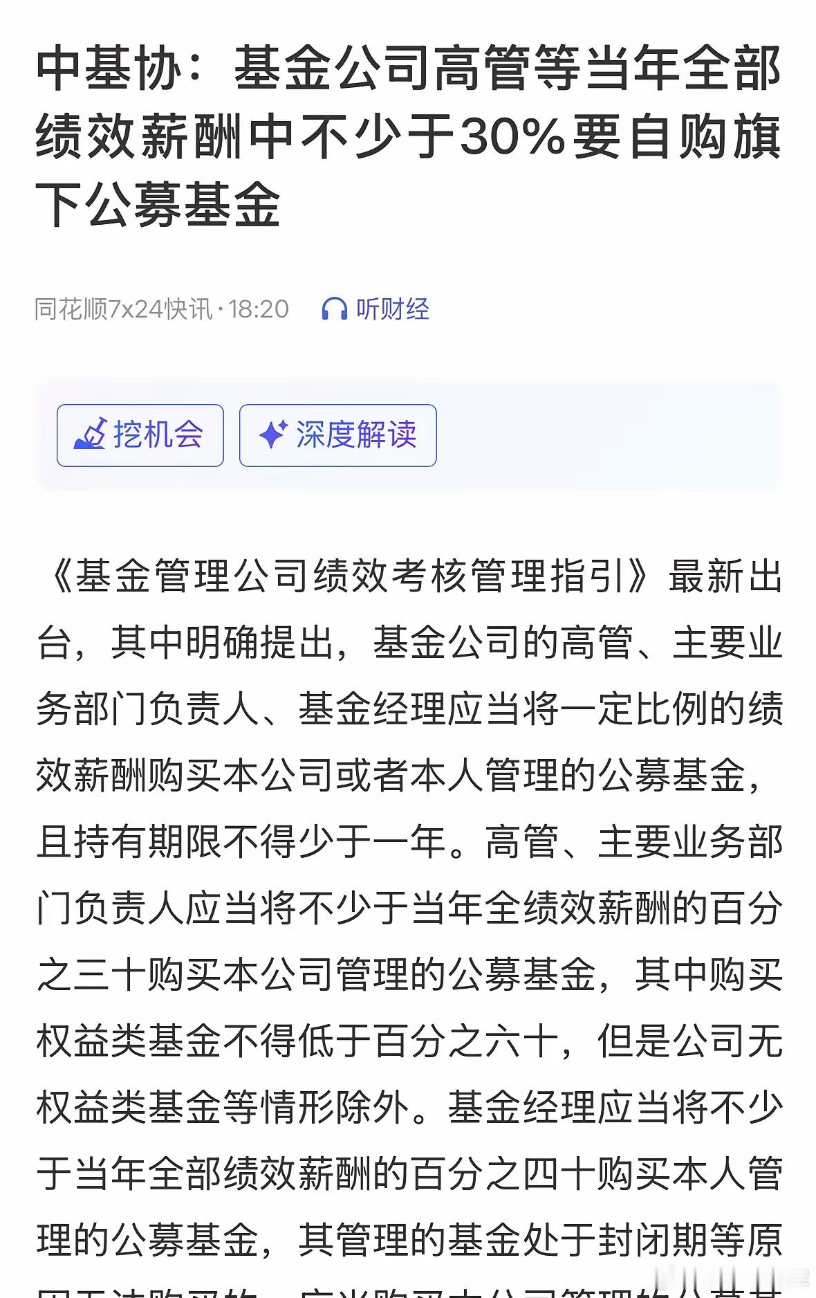 重磅利好消息基金高管要和基民共进退了,不仅要求自购基金还跟薪酬挂钩:2026年4月17日今天这个重磅利好消息真是太重磅了,《基金管理公司绩效考核管理指引》最新出台,利好基民购买公募基金的信心,我专业解读:一是基金公司的高管、主要业务部门负责人、基金经理应当将一定比例的绩效薪酬购买本公司或者本人管理的公募基金,且持有期限不得少于一年,这有利于长期投资;二是高管、主要业务部门负责人应当将不少于当年全绩效薪酬的百分之三十购买本公司管理的公募基金,其中购买权益类基金不得低于百分之六十,这实际上相当于基金高管和负责人要跟基民共进退,也提供了增量资金;三是基金经理应当将不少于当年全部绩效薪酬的百分之四十购买本人管理的公募基金,薪酬还跟基金收益挂钩,这就更利好公募基金了。整体看今年将是公募基金的信心之年,基金管理者和基民共进退,那些业绩优秀的优质个股将强者恒强,点赞关注验证!