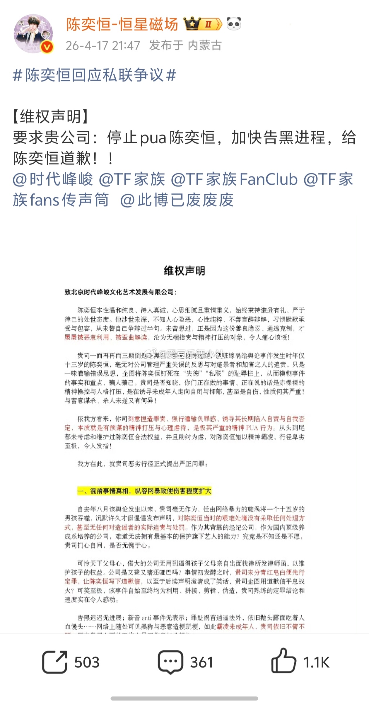 陈奕恒回应私联争议 陈奕恒sjz维权,要求公司停止pua陈奕恒,加快告黑进程👊