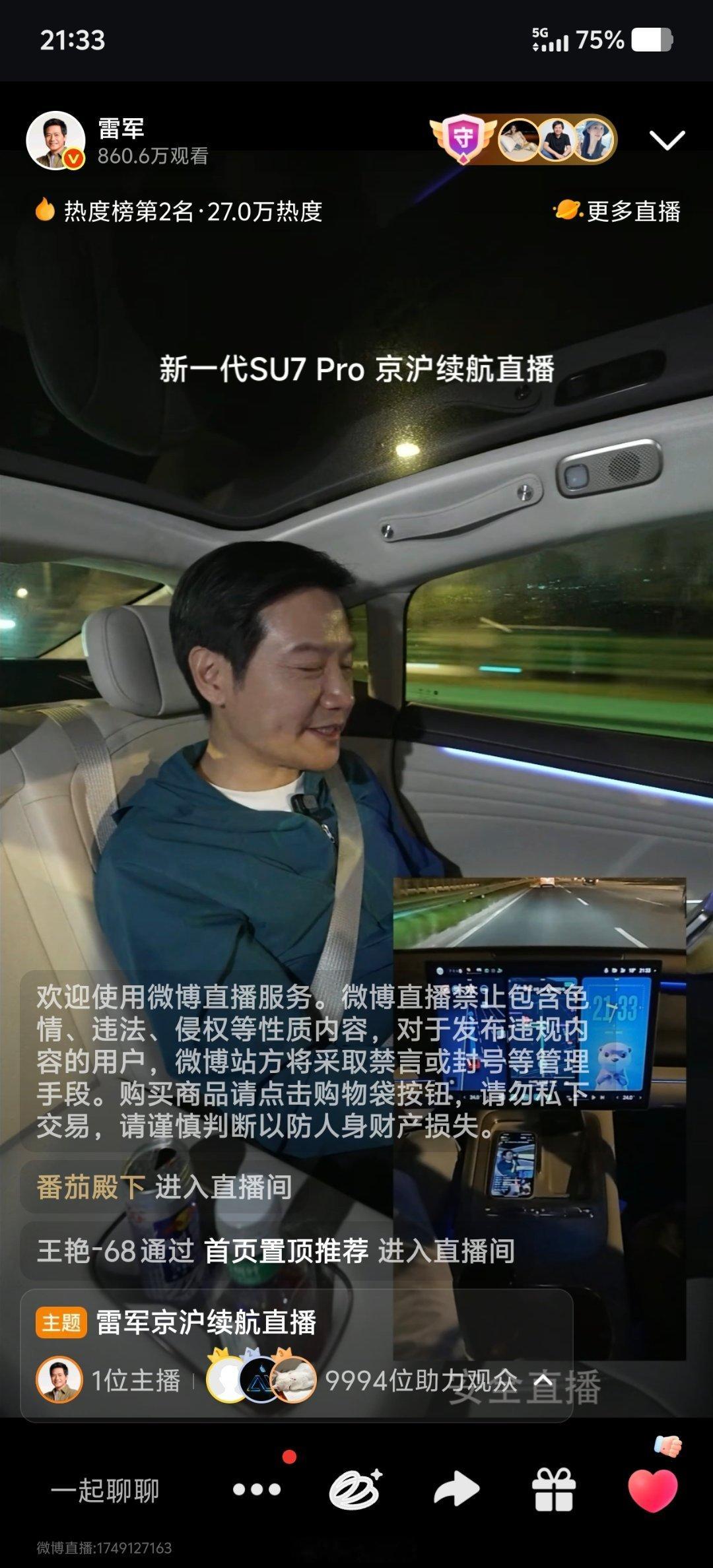 雷军SU7Pro京沪续航直播,数据很实在。雷军直播S1段跑了328km,平均车