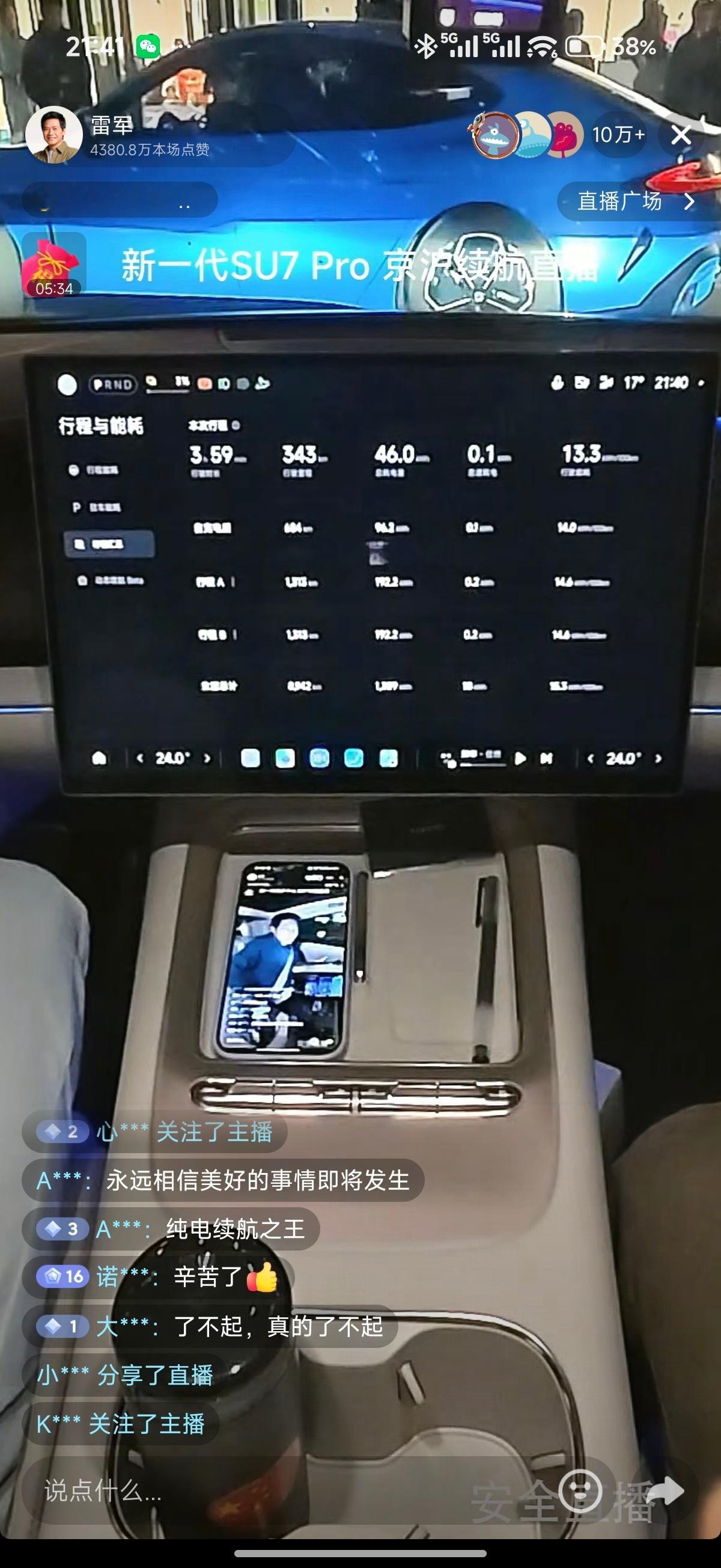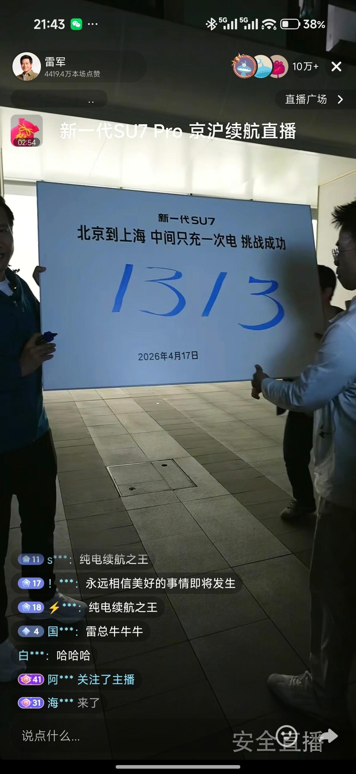 雷总今天直播15小时,从北京到上海,累计行驶1313公里,中途只充了一次电,平均能耗14.6,剩余电量3%,预估续航还有19公里。牛不牛 雷军达成京沪高速只充一次电