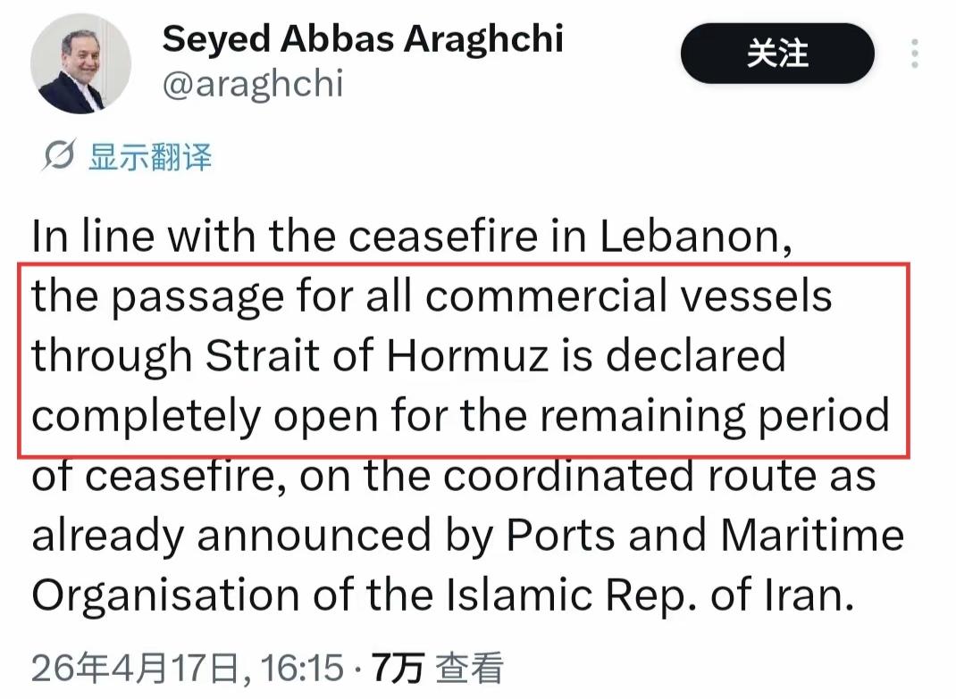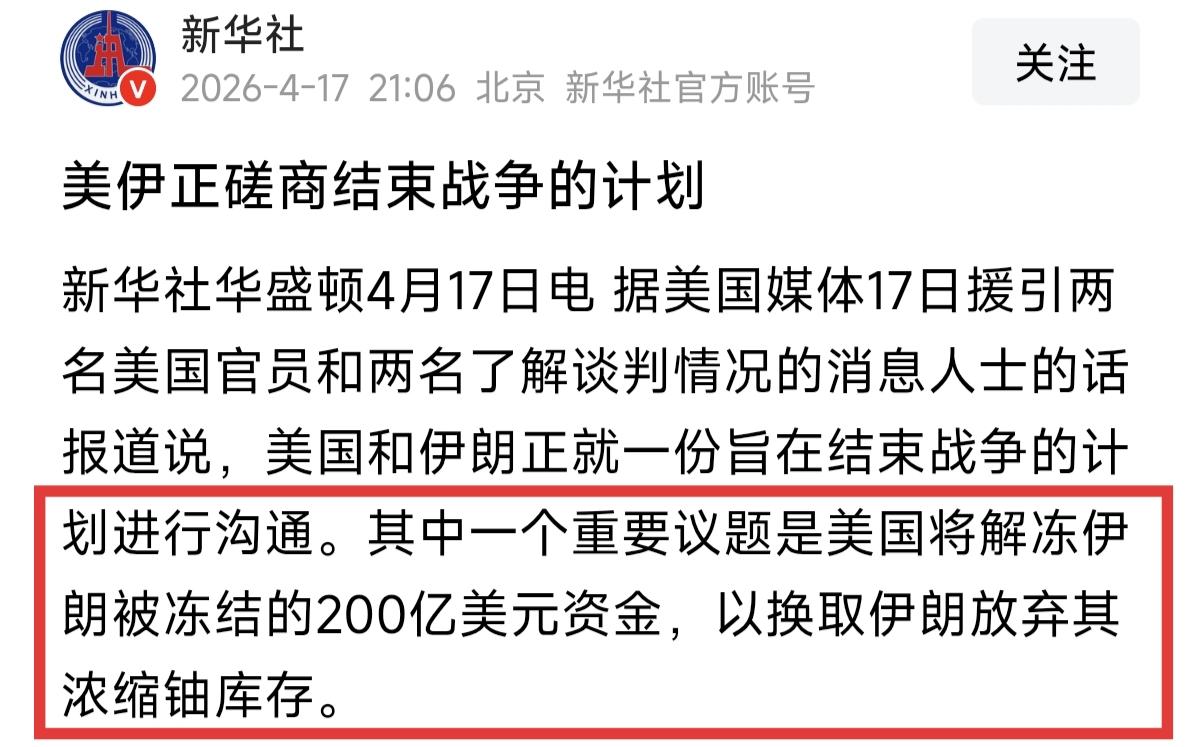 全场大狂欢!没想到海峡居然就这么开了。 伊朗外长阿拉格齐宣布:鉴于黎巴嫩和以色列达成停火,在剩余停火期限内,伊朗对所有商船开放霍尔木兹海峡,但要依照伊朗此前已公布的路线通行。 阿拉格齐没说收不收费的事,但不管怎样,现在伊朗把海峡打开了,球被踢到了美国一方。 据美媒报道:第二轮谈判将于本周日,在伊斯兰堡举行,美国有可能释放伊朗被冻结的200亿美元资产,以换取其浓缩铀材料。 懂王宣称:美国将获得这些被B2炸成尘埃的核材料,并禁止以色列再次轰炸黎巴嫩。 不过伊朗并没有同意将核材料移交给美国,目前一个折中方案是:部分浓缩铀运往第三国处理,另一部分在国际组织的监督下,于伊朗境内被稀释。 另外就是那解冻的200亿美元,现在还只是一个设想:最后究竟能解冻多少?有什么附加条件,能不能满足伊朗的要求?一切都是未知数。 大家发现没有:美股一开盘,就全是大利好,A股一开盘,就一会“经济狂怒”,一会封锁曼德海峡的,这玩意你跟谁说理去。 但不管怎样,目前双方都表现出了想要谈成的态度,那就静候佳音吧,希望别谈崩,否则下周一,又得抱头蹲好。