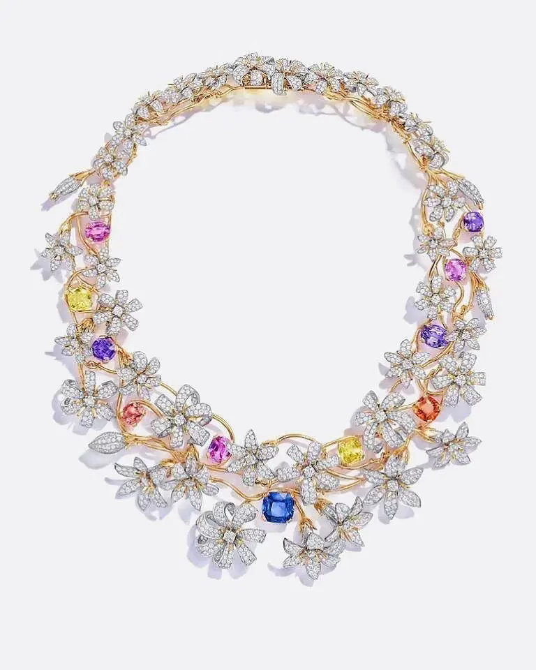 宋雨琦出席Tiffany&Co高级珠宝活动所戴的花卉钻石项链镶嵌了11颗总重超45克拉的垫形蓝宝石,搭配近 2500颗白钻,价值超千万!作为全场唯一受邀出席的华人面孔,什么含金量不用多说