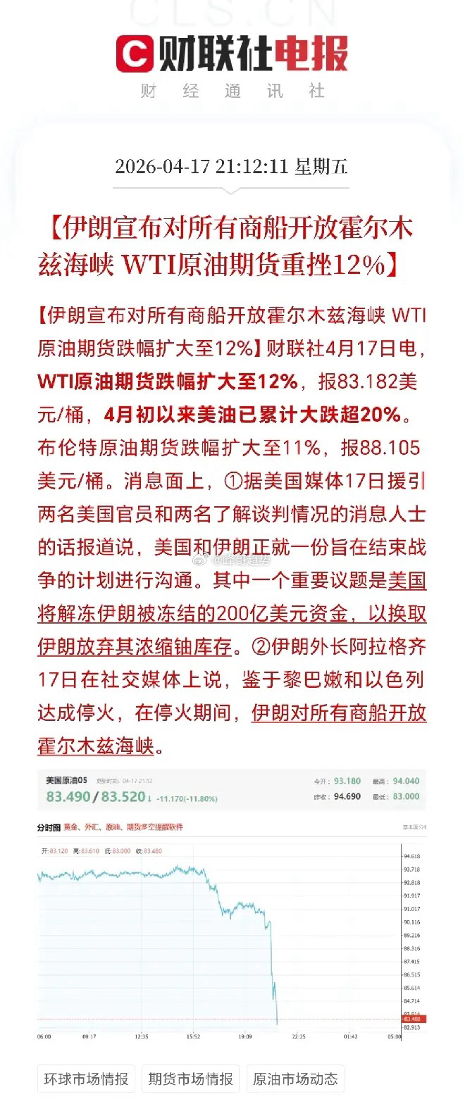 伊朗宣布对所有船只放开霍尔木兹海峡,这消息一出来,原油价格立马暴跌。
