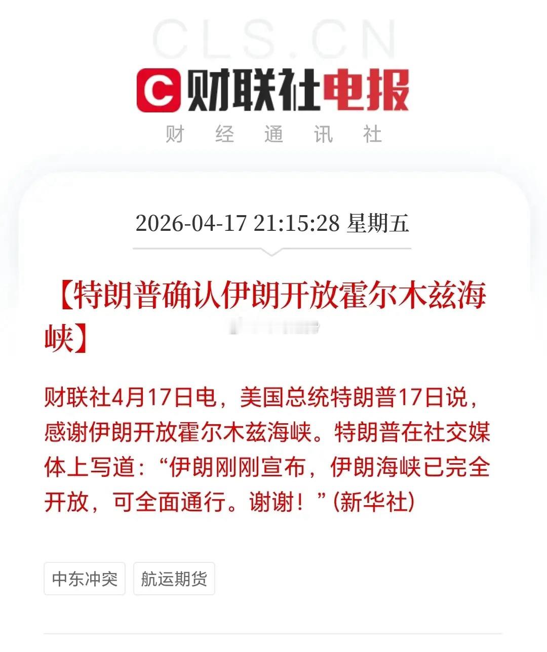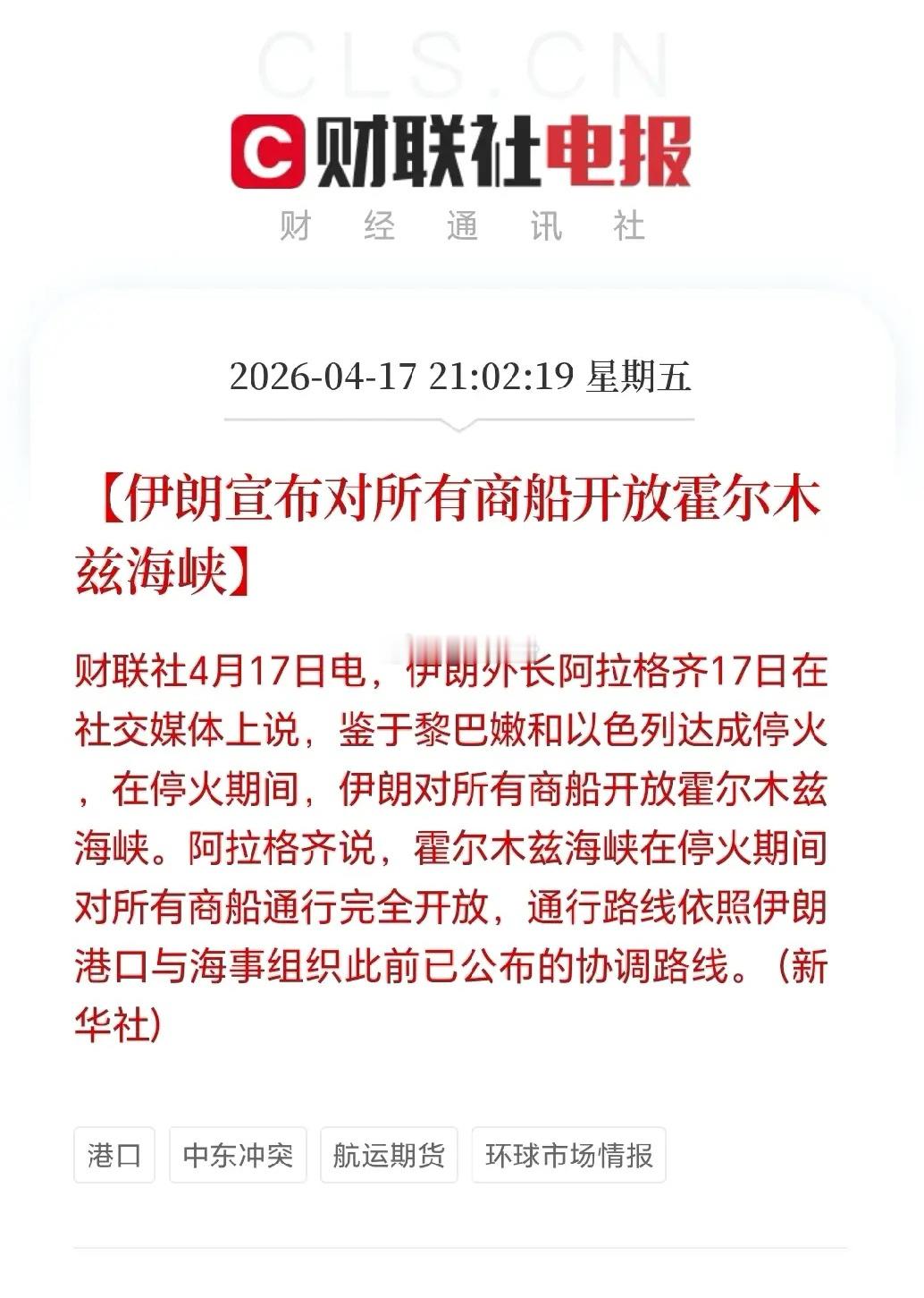 当地时间17日,伊朗外长阿拉格齐在社交媒体发文,基于黎巴嫩停火协议,在停火剩余时间里,商船按已公布路线通行该海峡完全开放。