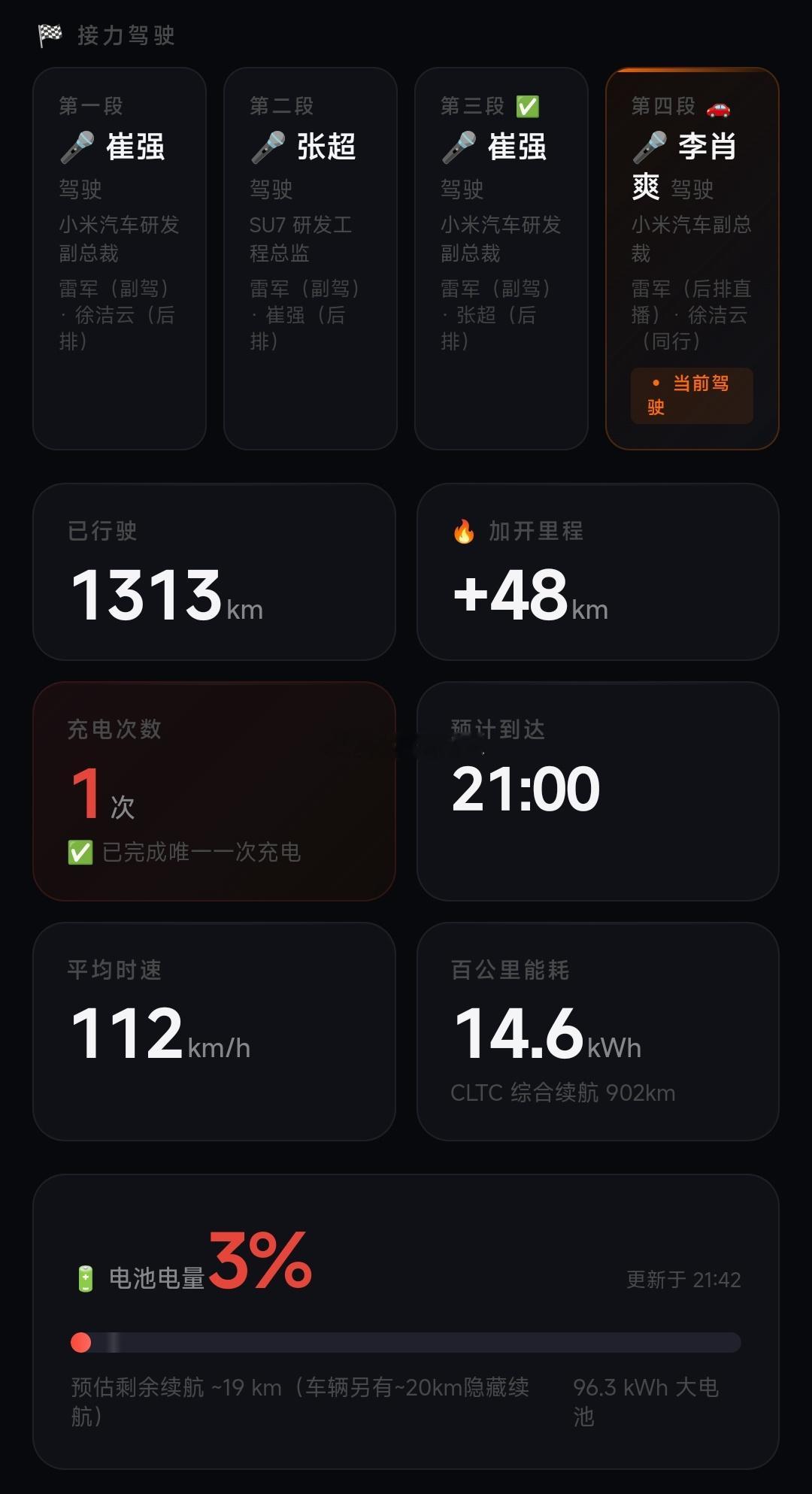 激动人心的时刻到了,15个小时,1313公里,全程能耗14.6,还剩3%的电