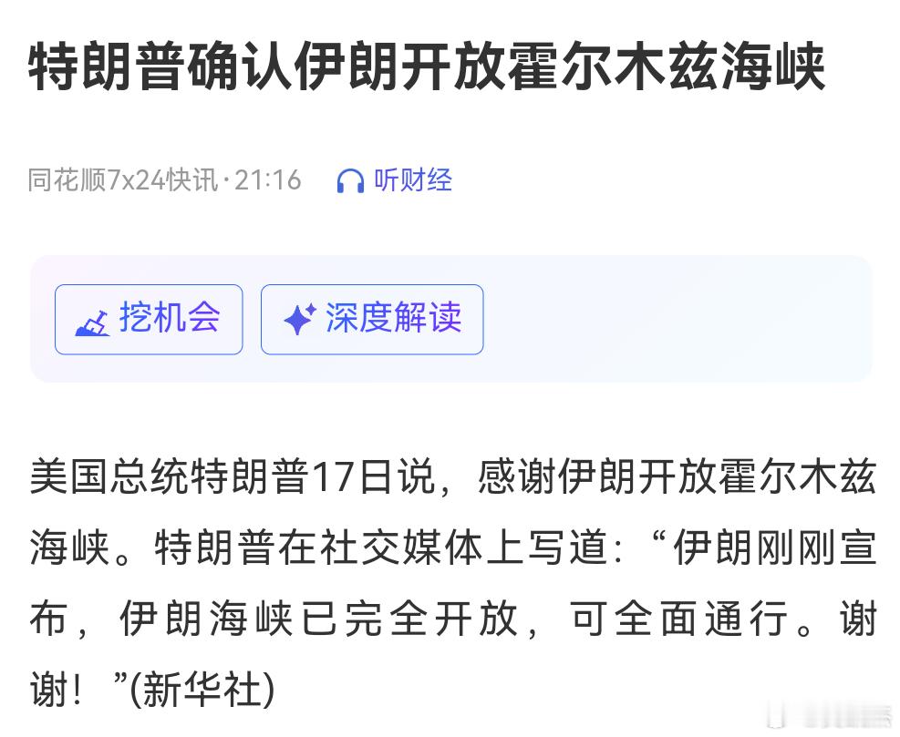 这个利好消息,是会卡时间的。美国总统特朗普17日说,感谢伊朗开放霍尔木兹海峡。特朗普在社交媒体上写道:"伊朗刚刚宣布,伊朗海峡已完全开放,可全面通行。谢谢!"