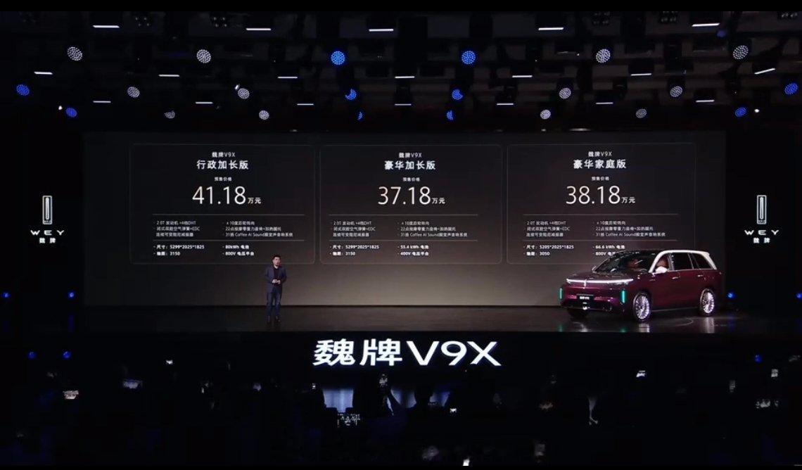 又一款 9 系旗舰 SUV 来了,魏建军亲自代言的魏牌 V9X,看出来魏总对这款车是寄予厚望魏建军为魏牌v9x品质背书 超级 Hi4:2.0T+4 档混动专用变速箱+800V+6C 超充混动技术全自研智能底盘:闭式全腔空悬、EDC 连续可变阻尼减震器、双向 20 度后轮转向每一款 9 系的旗舰车型都有各种看家本领预售价:38.18-41.18 万元