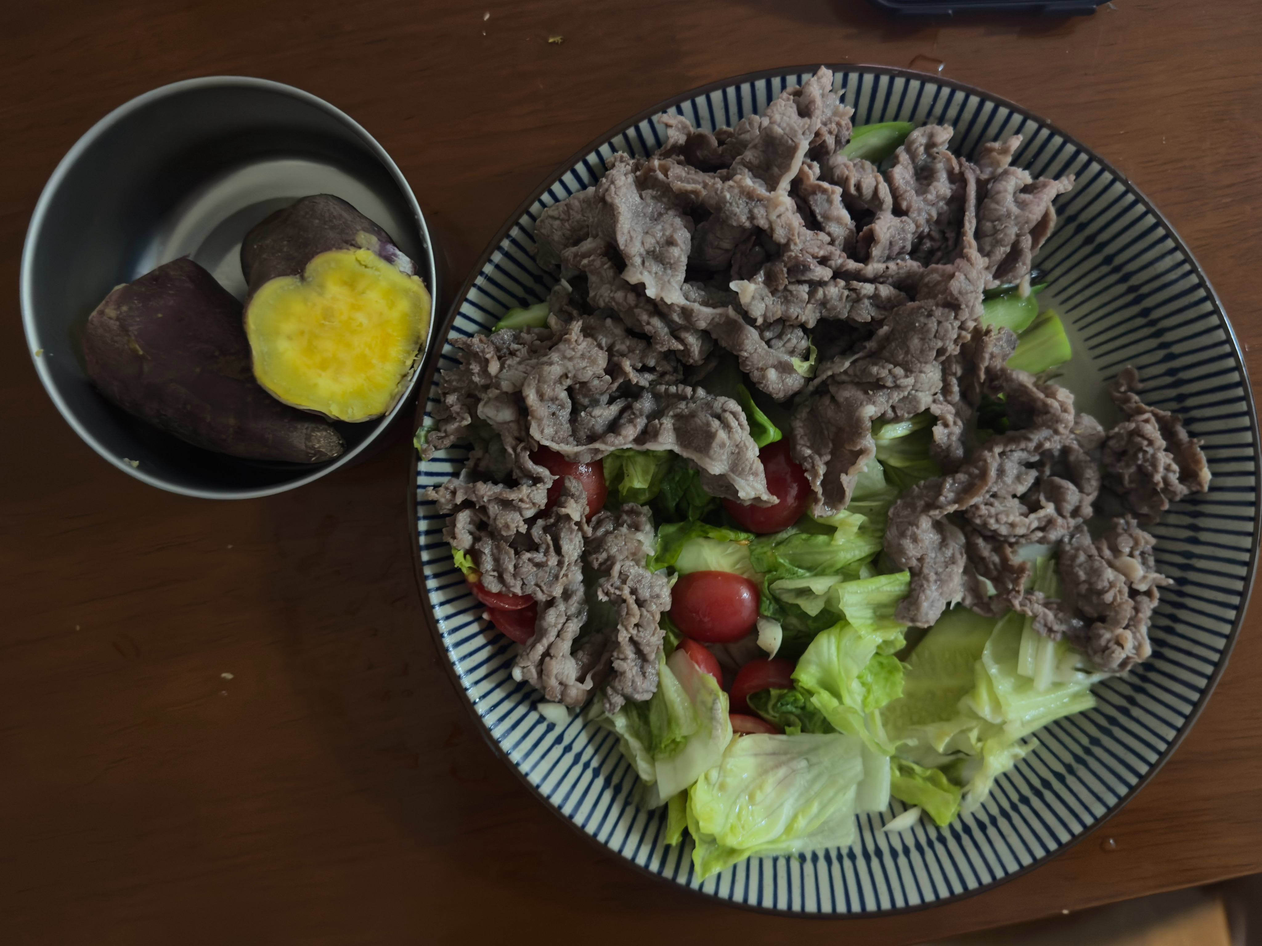 晚饭吃的啥?蔬菜沙拉🥗没有沙拉酱+牛肉+红薯偶遇大金毛,哎呀这个笑、这个舔,可爱的不行说好减脂的来打卡了,第3️⃣4️⃣天生活手记减脂