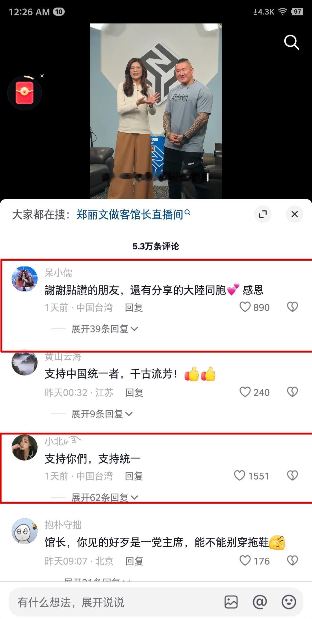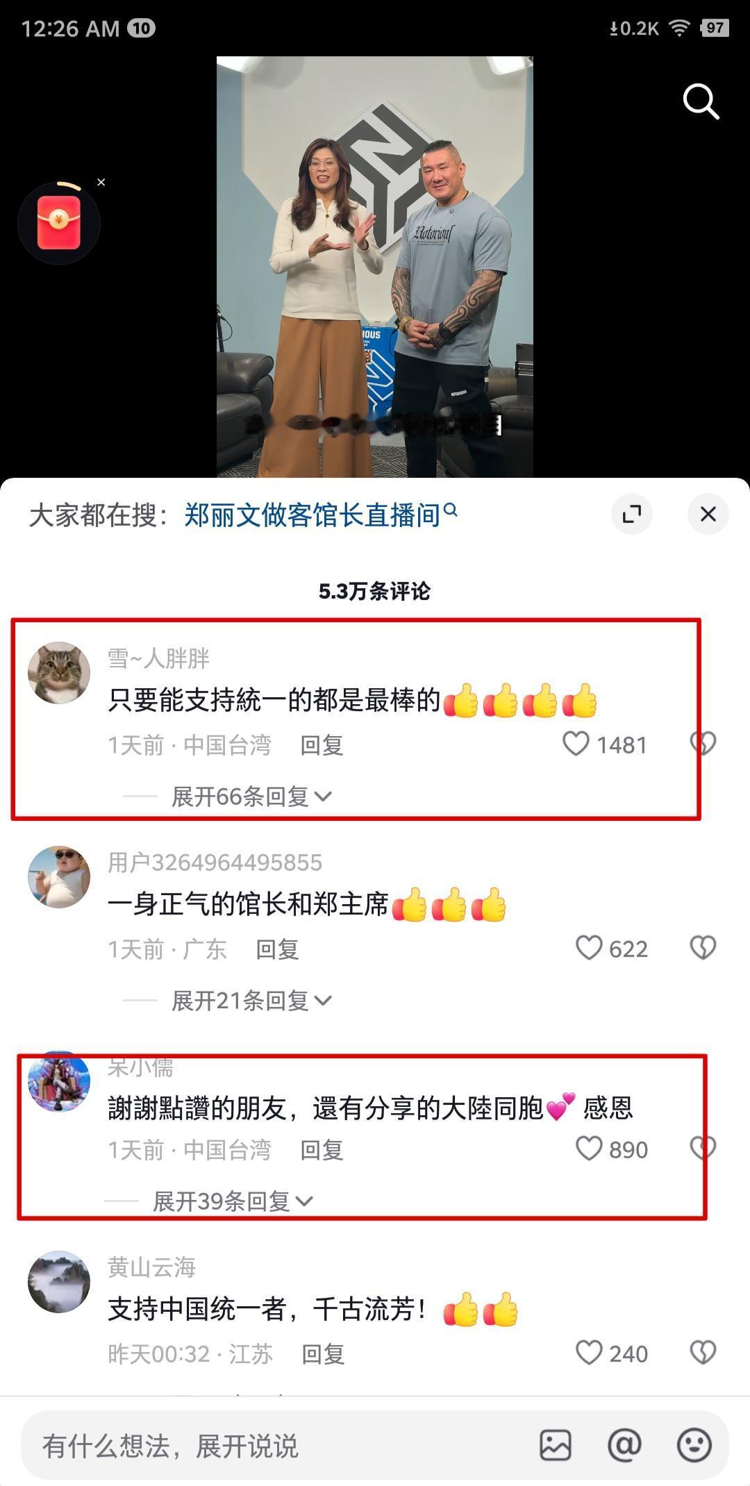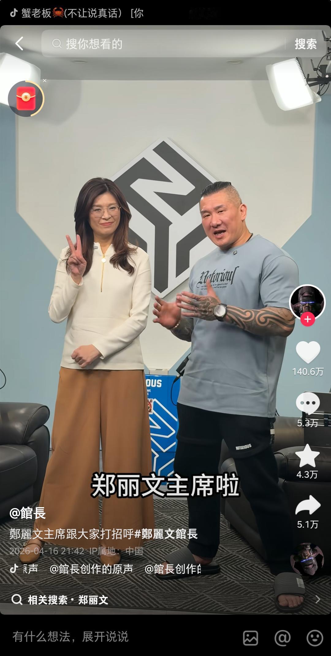 馆长邀请国民党主席郑丽文上他的访谈节目,单是在抖音发了个开场白打招呼的视频,就获得了140万点赞,按这个数据估算,播放量可能超过3000万,而且单是这条视频,馆长抖音粉丝量就大涨了20多万。评论也有5.3万条,而且有不少台湾同胞的留言,大家一致对两岸和平和祖国统一抱有欢迎及期盼。为热忱并勇敢推进两岸融合的馆长及郑丽文点赞!
