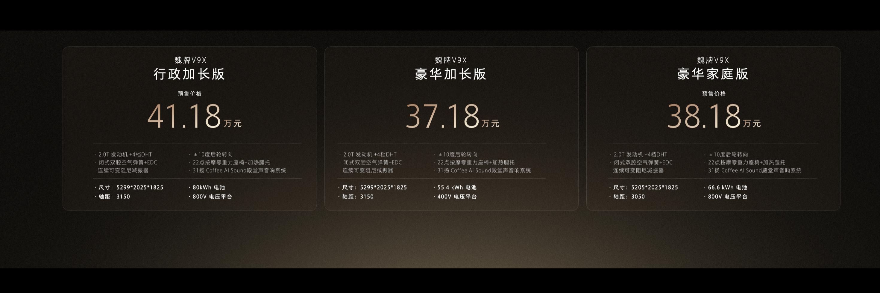 【37.18万元起,魏牌V9X正式开启预售】4月17日,魏牌V9X正式开启预售,共推出3款车型,预售价区间为37.18万-41.18万元。新车外观以东方建筑为灵感,前脸借鉴重檐庑殿顶形制,采用轴对称布局与层层递进线条,搭配Hi Light智慧大灯、中央悬浮发光LOGO及两侧修长灯带,提供6种驾驶辅助投影场景和多种迎宾场景,同时拥有9种外观颜色可选;车身尺寸有两种版本,长宽高分别为5205(5299)/2025/1825mm,轴距为3050(3150)mm。内饰配备12.3英寸仪表屏+双17.3英寸中控/副驾双联屏及二排21.4英寸娱乐屏,搭载8295P座舱芯片与小魏同学座舱智能体,实现全流程AI交互;同时配备31个扬声器的Coffee AI Sound音响系统与9.2英寸流媒体内后视镜,提升驾乘体验。座椅采用六座布局与Nappa真皮材质,搭配12处刺绣工艺。空间上,全车有48处储物空间,配备50W无线充电与冷暖双用冰箱,全系标配全电动车门与电动侧踏。辅助驾驶方面,搭载27个高性能传感器、Thor-U芯片及VLA大模型,搭配小魏同学行车智能体;动力基于800V高压架构,采用2.0T插混系统,提供三种电机功率版本,搭配三种电池组,CLTC纯电续航310-470km,综合续航1632-1700km。魏建军为魏牌V9X品质背书