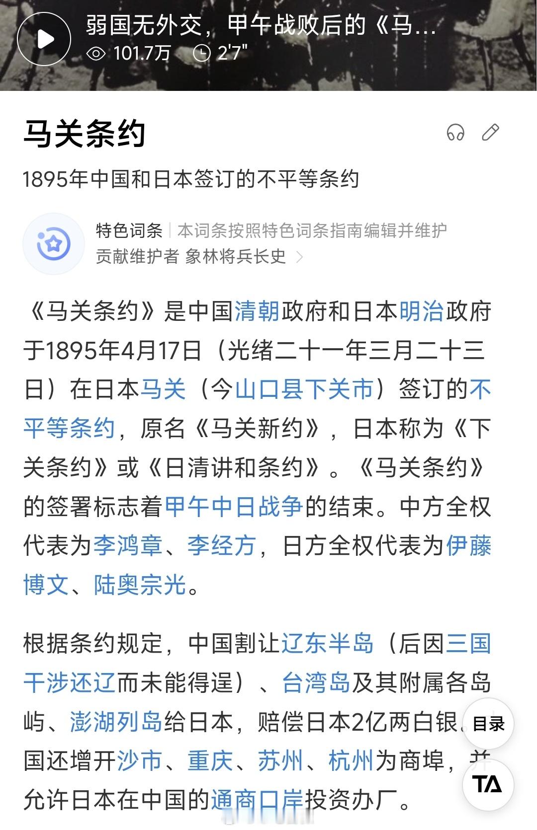 一日本自卫队舰艇进入台湾海峡 1895年4月17日(光绪二十一年三月二十三日),《马关条约》签订。根据条约规定,中国割让辽东半岛(后因三国干涉还辽而未能得逞)、台湾岛及其附属各岛屿、澎湖列岛给日本,赔偿日本2亿两白银。中国还增开沙市、重庆、苏州、杭州为商埠,并允许日本在中国的通商口岸投资办厂。日本今日此举,绝对是别有用心