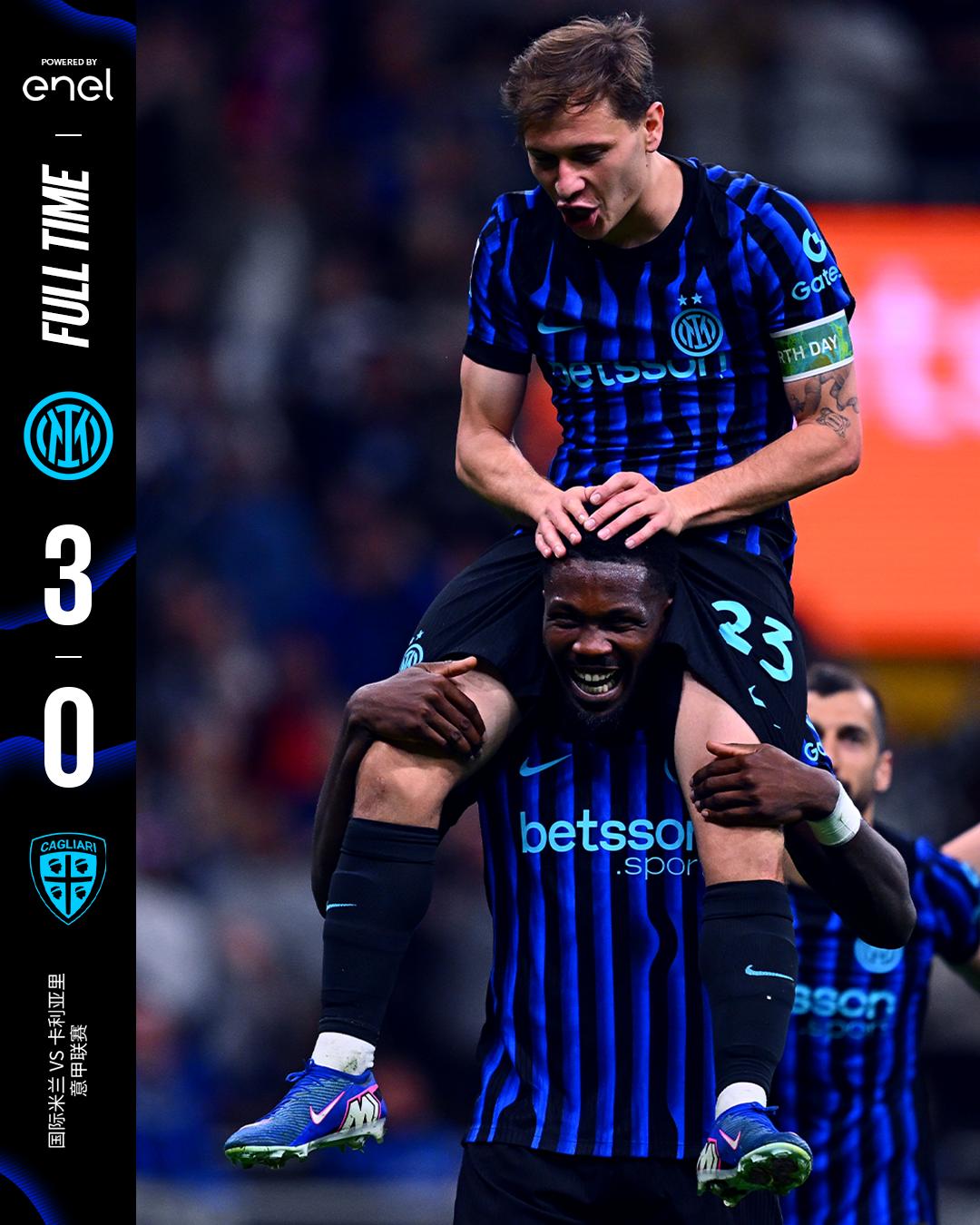 北京时间4月18日凌晨2:45,我们在意甲联赛第33轮比赛中主场迎战卡利亚里,结果在上半场0比0战平的情况下,下半场凭借小图拉姆、巴雷拉和泽林斯基的进球,我们3比0击败对手,继续领跑意甲积分榜。