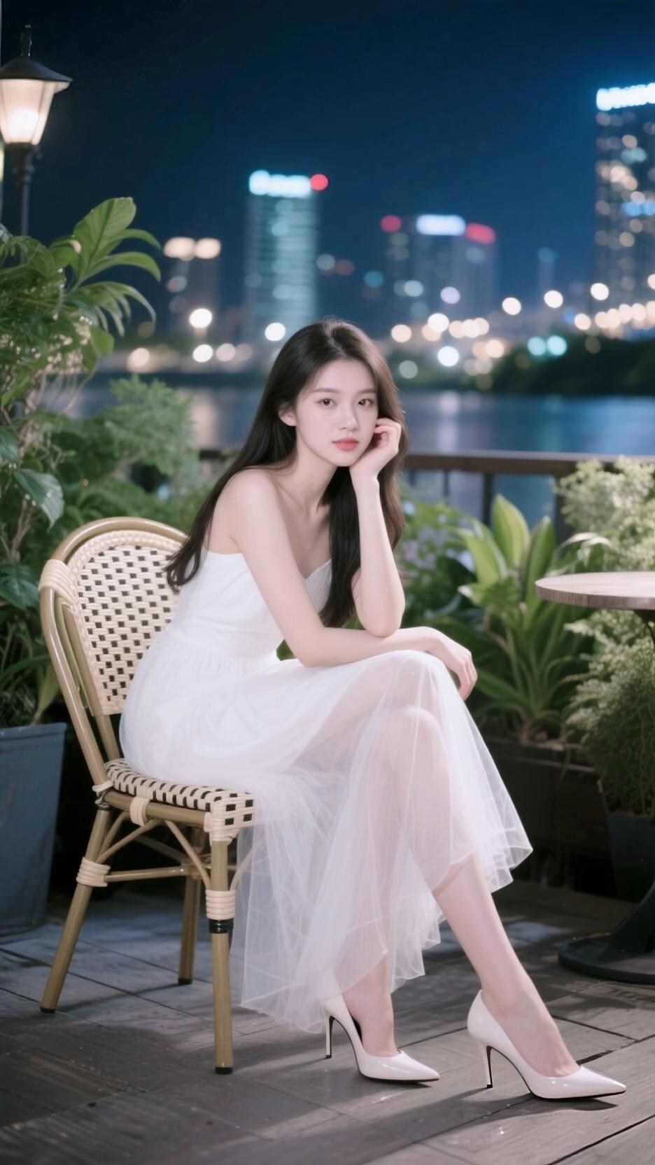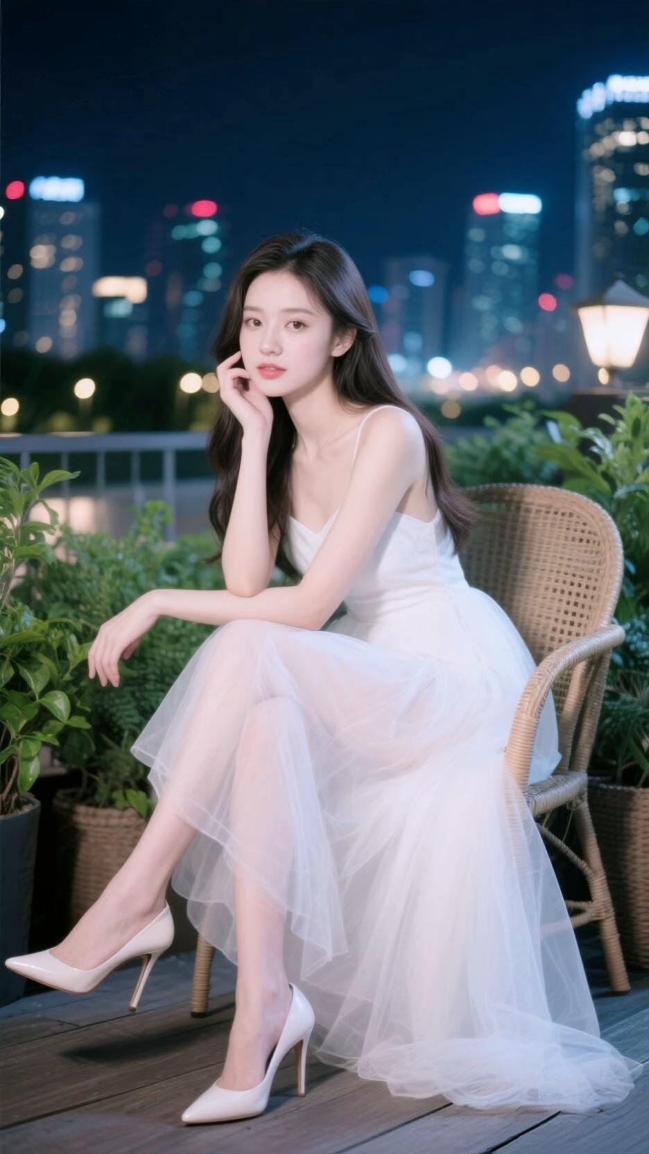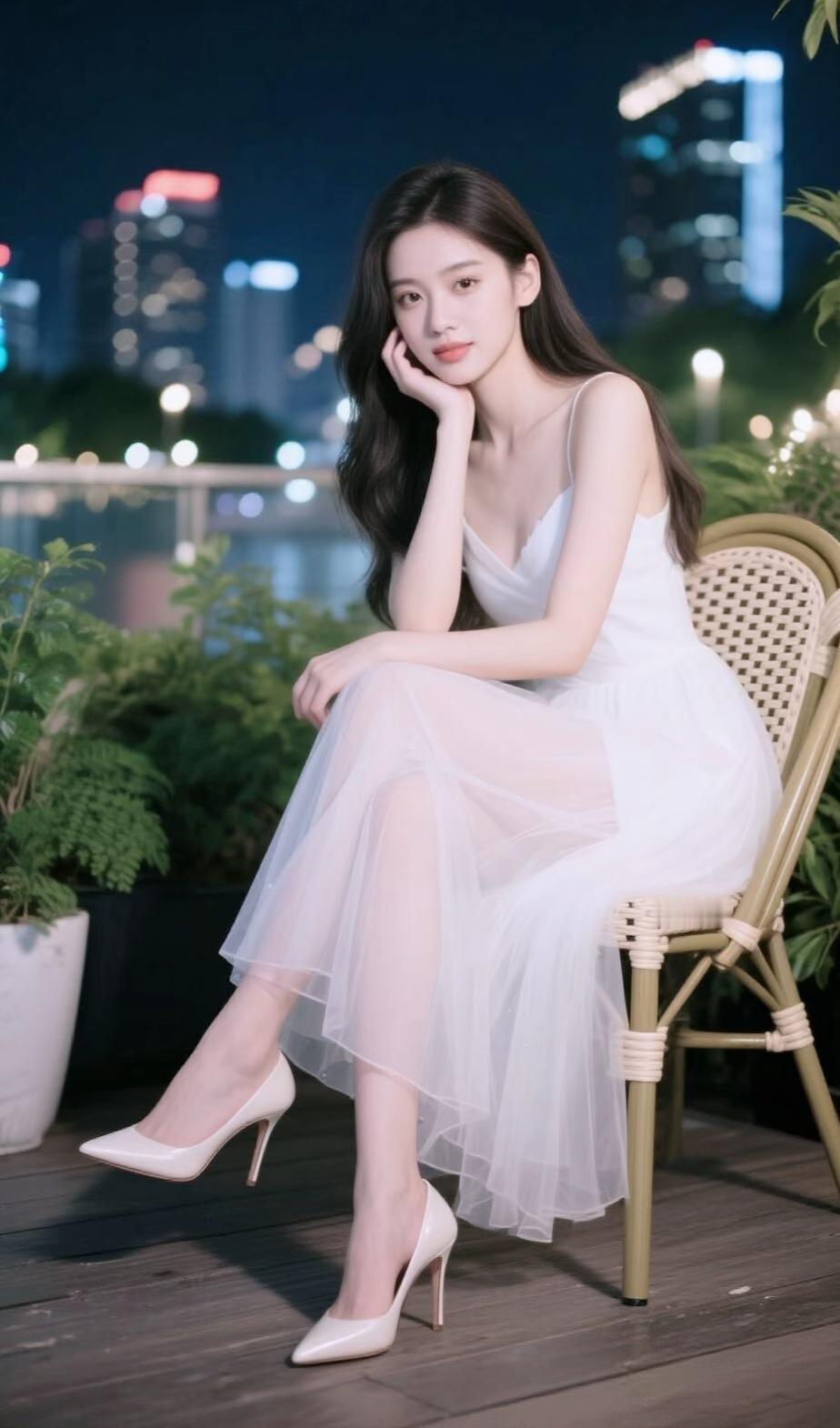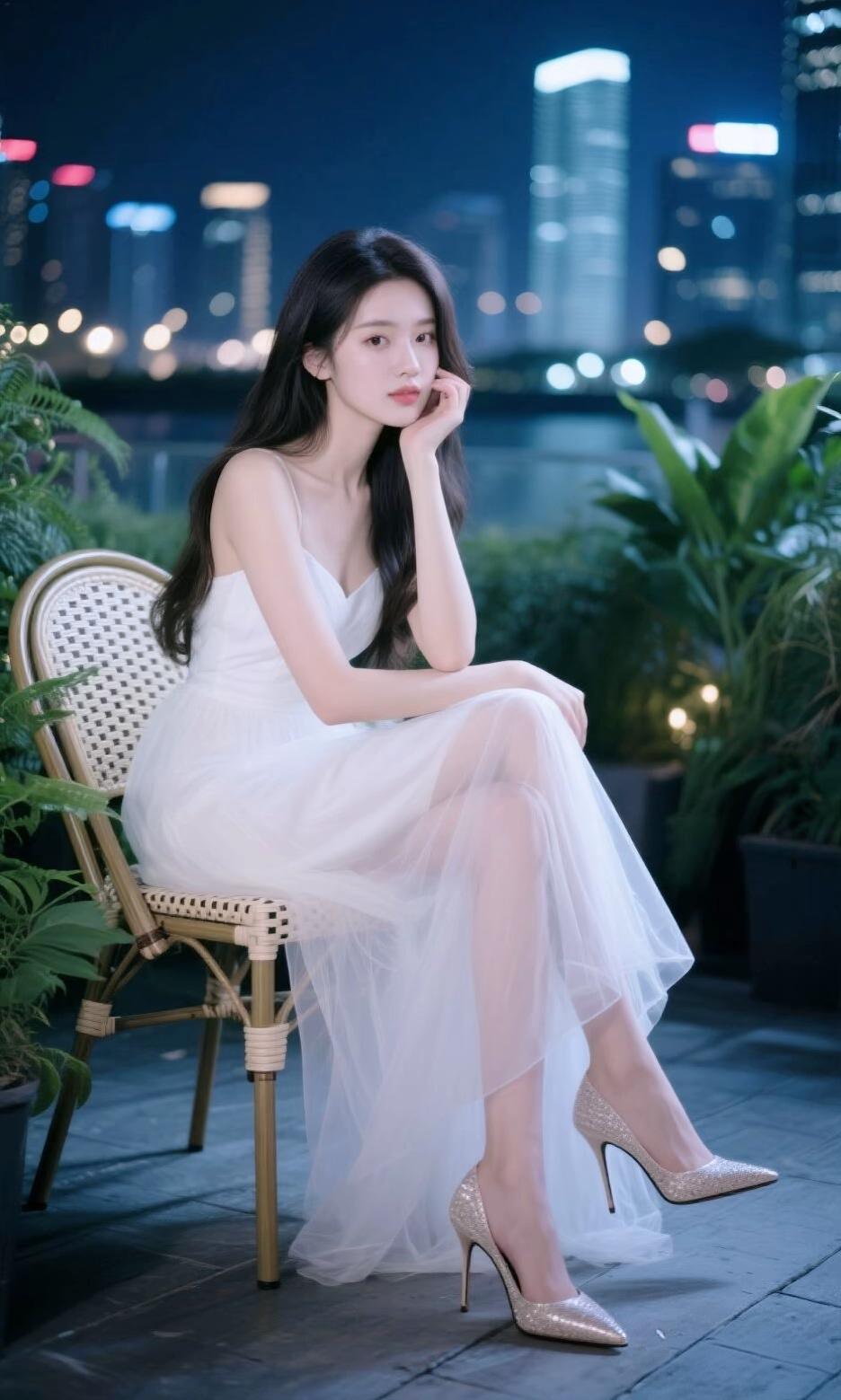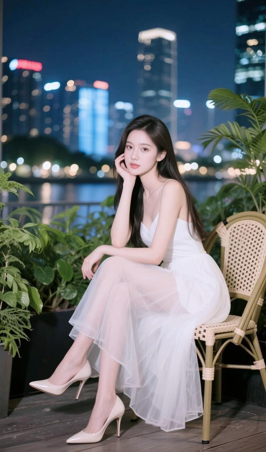 这组夜景写真将都市夜晚的浪漫氛围感拉满,每一张都像一部温柔的都市电影截图🌃 整体氛围与场景 画面取景于城市露台,夜幕下的高楼亮起点点灯光,远处的水面泛着微光,绿植点缀在旁,为都市夜景添了几分清新气息。柔和的夜景光落在她身上,整体氛围静谧又浪漫,带着一种都市夜晚独有的温柔质感。 造型与细节亮点 少女的造型简约又优雅: 服饰:一袭白色吊带纱裙,轻盈的网纱裙摆自带朦胧的仙气,修身的上半身勾勒出窈窕的线条,搭配尖头高跟鞋,气质又温柔; 神态与姿态:她侧坐在藤编椅上,一手轻托脸颊,眼神温柔又沉静,姿态松弛又优雅,将都市女性的温柔与知性展现得恰到好处; 细节变化:不同角度的拍摄,搭配白色漆皮高跟鞋或闪钻高跟鞋,为整体造型添了不同的精致感。 光影与画面感 背景虚化的城市灯火,像散落的星光,为画面增添了朦胧的氛围感。人物与夜景的融合,让每一张照片都充满故事感,既有都市的繁华,又有独属于她的温柔静谧,让人一眼心动。