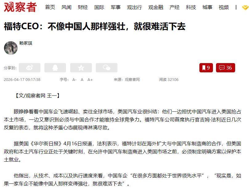 福特CEO说实话:学不会中国人的能耐,车企迟早活不下去 美国福特汽车的CEO法利被《华尔街日报》4月16日报道了,他说的一句话火了:现在汽车行业,要是学不会中国人的能耐,变得够强壮,迟早活不下去。 除此之外,他还说,福特打算在国外多和中国车企合作,但又提到,美国政府和本土汽车行业正处在关键时候,要是让中国车企进美国市场,得先定好规矩,保护好美国人的工作岗位。 有人说他是吹捧中国,其实真不是,他说的都是实打实的事儿。作为美国老牌汽车企业的老大,法利天天跟全球车企打交道,比谁都清楚现在竞争多狠,也比谁都明白中国车企有多厉害。 他说这话,不是抬举咱们,是没办法,更是认清现实——以前汽车市场,都是欧美日韩说了算,现在中国车企闯出来了,跟不上的,只能被淘汰。 先跟大家说清楚,他说的“强壮”,不是说人身体好,是车企的真本事,就三样:技术、成本、办事速度,咱们用大白话讲,一听就懂。 先说技术,以前咱们总觉得,买汽车得选欧美、日本的,觉得人家技术好、质量硬。现在不一样了,中国车企的新能源技术,早就走到世界前面了。 就说电池,比亚迪、宁德时代造的,又安全、续航又长,充电还快,不光国内车企用,很多国外车企都得从中国买。 还有车机系统,中国的操作简单、功能全,中老年人也能轻松上手,不像国外的,复杂得让人头疼,法利也承认,中国车企的技术,很多方面都是世界第一。 技术厉害还不算,中国车企还有个大优势——省钱。咱们中国从汽车零件生产到整车组装,一套流程都能自己搞定,成本比欧美车企低不少。 同样一款新能源车,中国车企造出来能卖得便宜,还不耽误质量和配置;欧美车企不行,零件靠进口、人工还贵,造同样的车,卖贵了没人买,卖便宜了就亏本。 福特这些年搞电动车转型,花了好多钱,还一直亏损,反观比亚迪、吉利,不仅不亏还赚钱,就是因为成本控制得好。 还有办事速度,国外车企造一款新车,得三四年;中国车企两年就够了,快了一倍还多。为啥这么快? 因为中国车企反应快,老百姓喜欢啥功能、啥款式,很快就能调整,不用反复造样品,又省时间又省钱。 知道了这些,就明白法利为啥说那句话了,福特自己就跟不上节奏了,在全球卖电动车都不行,在中国市场,月销量有时候还不到100辆,连中国造车新势力的零头都比不上。 所以他想和中国车企合作,说白了就是想抱大腿,靠中国的技术和成本优势,才能活下去。 可这里有个矛盾,福特想合作,美国政府却拦着,不让中国车企进美国市场,又是加高额关税,还想禁止中国汽车的联网软硬件进入美国,说白了就是怕中国车企抢了他们的饭碗。 有意思的是,美国老百姓不傻,不少人愿意买中国车,毕竟又好又便宜,和美国政府的强硬态度完全不一样。 法利也挺无奈,前一天还说中国车企会摧毁美国汽车工业,后一天就说要合作,说白了就是怕得罪政府,又怕自己被淘汰。 其实他这话,不光说给福特听,也是说给所有国外车企听的。中国车企能发展这么快,不是靠运气,是靠咱们中国人的拼劲,拼命搞研发、抓质量,才有今天的成绩。 美国车企光靠政府保护,不学习、不改变,迟早被淘汰。说到底,实力才是硬道理,光靠保护,永远强不起来。