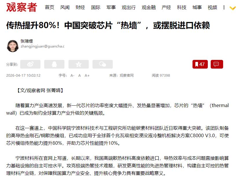 咱们国家在芯片上,搞出了个实打实的硬突破,不玩虚的! 中科院宁波材料所的团队,做出来一种新的芯片散热模组,往芯片上一用,传热速度直接快了80%,芯片性能也变好了10%。 最关键的是,这技术是咱们自己研发的,以后高端芯片的散热材料,不用再求着进口,再也不用看别人脸色。 可能有人会问,散热这点事,至于这么大阵仗?真不至于夸大,咱们平时用手机就知道,夏天玩一会儿就发烫、卡顿,这就是散热不好闹的。 现在芯片越来越厉害,运算越来越快,发热也越来越猛,热量散不出去,芯片就不敢全力工作,再热就会被烧坏,这就是大家常听的“热墙”,不光咱们国家头疼,全世界都解决不了。 以前更憋屈,咱们高端芯片的散热材料,基本都是从国外买的。不是咱们不想自己做,是技术不够,做不出来能满足高端芯片需求的材料。 进口的又贵,人家还可能随时不给咱们供货,一旦被卡脖子,咱们的超算、AI设备,甚至一些高端医疗设备,都得歇菜。 这次立功的中科院团队,总算把这个难题解决了,做出来的是高导热金刚石/铜散热模组。 别一听“金刚石”就懵,其实就是咱们说的钻石,它导热比铜厉害好几倍;铜大家都熟悉,导电导热都不错,还容易加工。 团队就是把这俩材料结合起来,可不是简单混一起,里面的技术难点不少,比如钻石颗粒不好分散、俩材料粘不牢,都被他们一一搞定了,还能批量生产,不是实验室里的样品,能真正用到设备上。 这种散热模组,已经用在了一个高端散热整机柜上,专门给超大规模服务器、高端AI芯片散热,以前的散热方案根本扛不住这么大的功率,咱们的模组一上,效果立马就上来了。 传热快80%,意思就是芯片的热量能快一倍散出去,芯片不发烫,性能自然就提升了10%,别小看这10%,在高端芯片领域,已经是很大的突破了。 这突破真能让咱们摆脱进口依赖吗?肯定能!现在咱们自己能做出和国外一样好的散热模组,还能批量用,核心技术握在自己手里,不用再买进口的了。 更省心的是,咱们国家人造金刚石产量占全球90%以上,原材料有的是,成本也能控制住,以后不光能满足自己用,说不定还能出口,从“进口”变成“出口”。 这事儿跟咱们普通人也有关系,以后手机玩久了不那么烫、不卡顿,医院的检测设备更稳定,超算处理数据更快,这些都离不开这个散热技术。 这不是什么不起眼的小突破,芯片产业就像拼木桶,散热以前就是短板,现在短板补上了,咱们的芯片产业就能更稳地发展。 这突破也不是一天两天能成的,科研人员熬了好多年,一步步攻克难题,才做出这个成果,值得咱们点个赞。 总的来说,这次的突破,不光是做出了好用的散热模组,更打破了国外的垄断,给咱们芯片产业争了气,相信以后咱们还会有更多这样的突破,真正实现芯片自主自强。