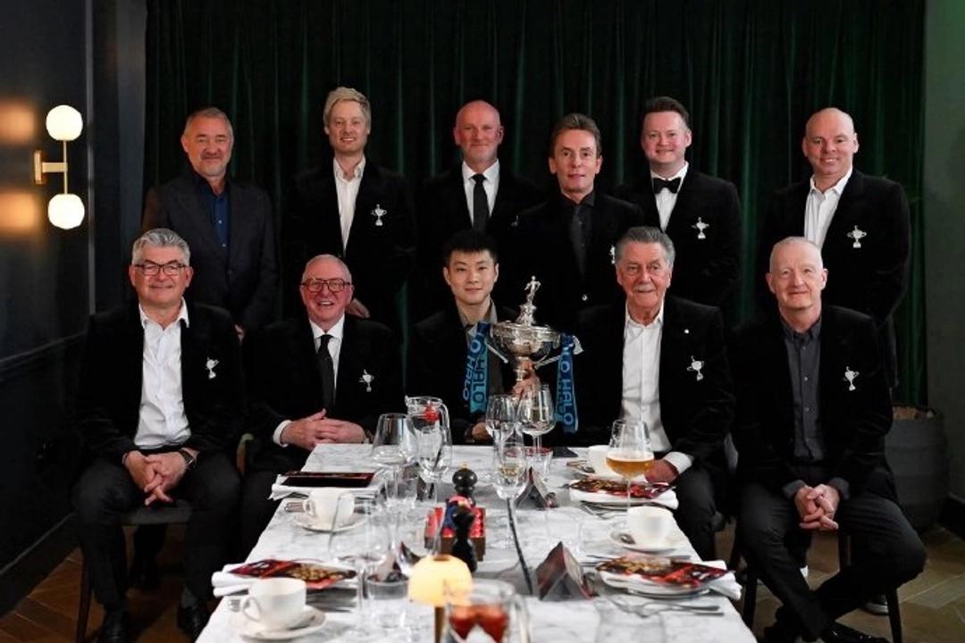 谁能想到,有朝一日中国选手能在斯诺克最高规格晚宴上,稳稳坐在一众传奇正中央。 4月17日晚,WPBSA第二届世界冠军晚宴在谢菲尔德举行,11位前克鲁斯堡冠军悉数到场。 而全场最核心的位置,留给了2025年世锦赛冠军赵心童。 他手捧刻着自己名字的奖杯,身边是亨德利、戴维斯、罗伯逊这些响当当的名字。 这不是客套,是斯诺克界用最传统的方式,向新王致敬。 想当年,这项运动被欧美垄断了近百年,中国球员连挤进正赛都难。 从丁俊晖的突破,到如今赵心童捧起世锦赛奖杯。 从资格赛一路拼杀,到决赛力克强敌,他硬生生打破了天花板。 今天这张合影,不只是一张照片。 是中国斯诺克从追赶者,变成被认可的强者的最好证明。 明天他就要踏上卫冕之路,愿这份荣耀,能化作他场上的底气。 中国选手,值得所有掌声,也配得上所有礼遇。