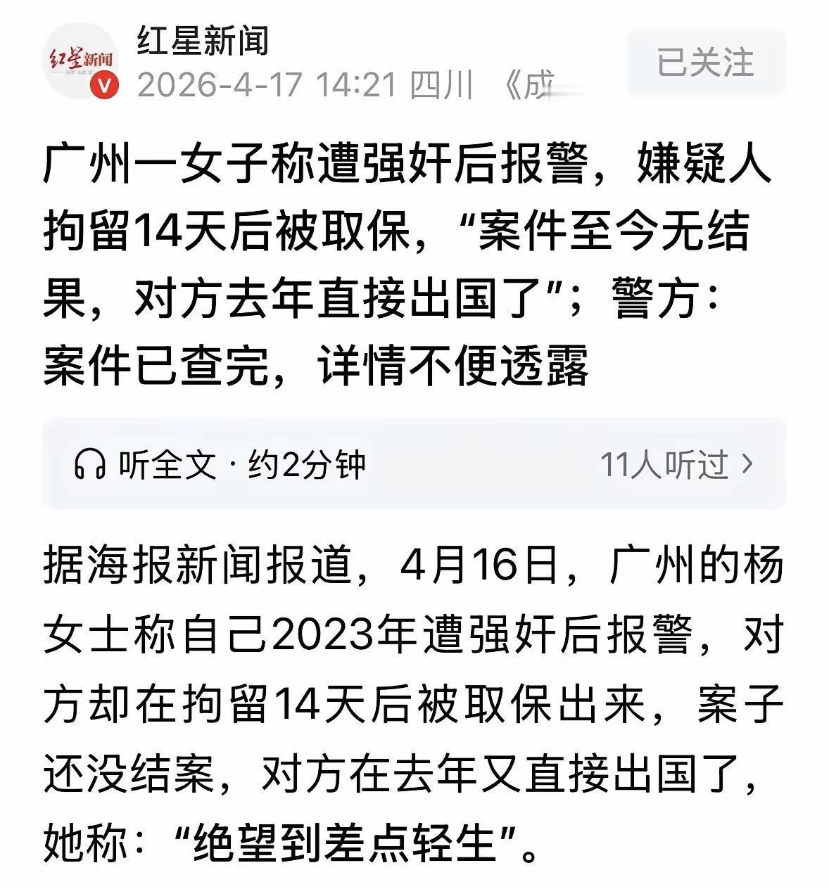 广东广州,女子遭到一男子侵犯,她的隐私处和贴身衣物都检测出了对方的DNA,证据确凿,她原以为男子会受到严惩,没想到对方只被拘留14天,就办了取保候审出来了,还自由自在跑去国外避风头,女子迟迟讨不回公道,撑不下去了,最绝望的时候,她把遗嘱都写好了。 杨女士这两年过得如同在地狱里走了一遭。身体上的伤害或许会慢慢恢复,可心里的伤口,却不是几句安慰就能抹平的。每当夜深人静的时候,那段经历就像一块石头压在胸口,让人喘不过气来。 更让她难受的,不只是遭遇本身,而是漫长等待中的无力感。原本以为证据清楚,事情很快就能有结果,没想到现实远比想象中复杂。时间一天一天过去,案件迟迟没有迎来她期待中的答案,心气也一点点被磨掉了。 很多人可能不理解,为什么受害者总是走不出来。说白了,这种伤害带来的影响,不只是某一天的痛苦,而是会渗进生活的方方面面。害怕出门,害怕独处,害怕陌生人的眼神,甚至连正常睡觉都成了奢侈。别人看她表面正常,只有她自己知道,内心早已千疮百孔。 最让人心酸的是,她在最绝望的时候,竟然连遗嘱都提前写好了。一个人得被逼到什么地步,才会在本该好好生活的年纪,开始安排身后事。看到这里,谁能不揪心? 这件事也提醒了很多人,受害者真正需要的,从来不只是嘴上的同情,而是及时、公正、清晰的处理结果。拖得越久,伤口越难愈合。每一次等待,对当事人来说,都是精神上的二次消耗。 很多类似事件里,大家总把注意力放在热搜和争议上,却忽略了那个正在承受痛苦的人。她不是新闻里的一个名字,也不是几行文字里的主角,她是一个真实生活着的人,有家人,有情绪,也有撑不住的时候。 法律的意义,不只是惩戒违法者,更是给受伤的人一个交代,让她知道自己没有被世界抛下。公平来得太晚,就很难真正安慰人心。大家之所以关注这件事,说到底是在关注每个人最基本的安全感。 希望杨女士能等来一个清楚明白的结果,也希望所有经历过伤害的人,都能被认真倾听,被妥善保护,被公正对待。别让勇敢站出来的人,寒了心。
