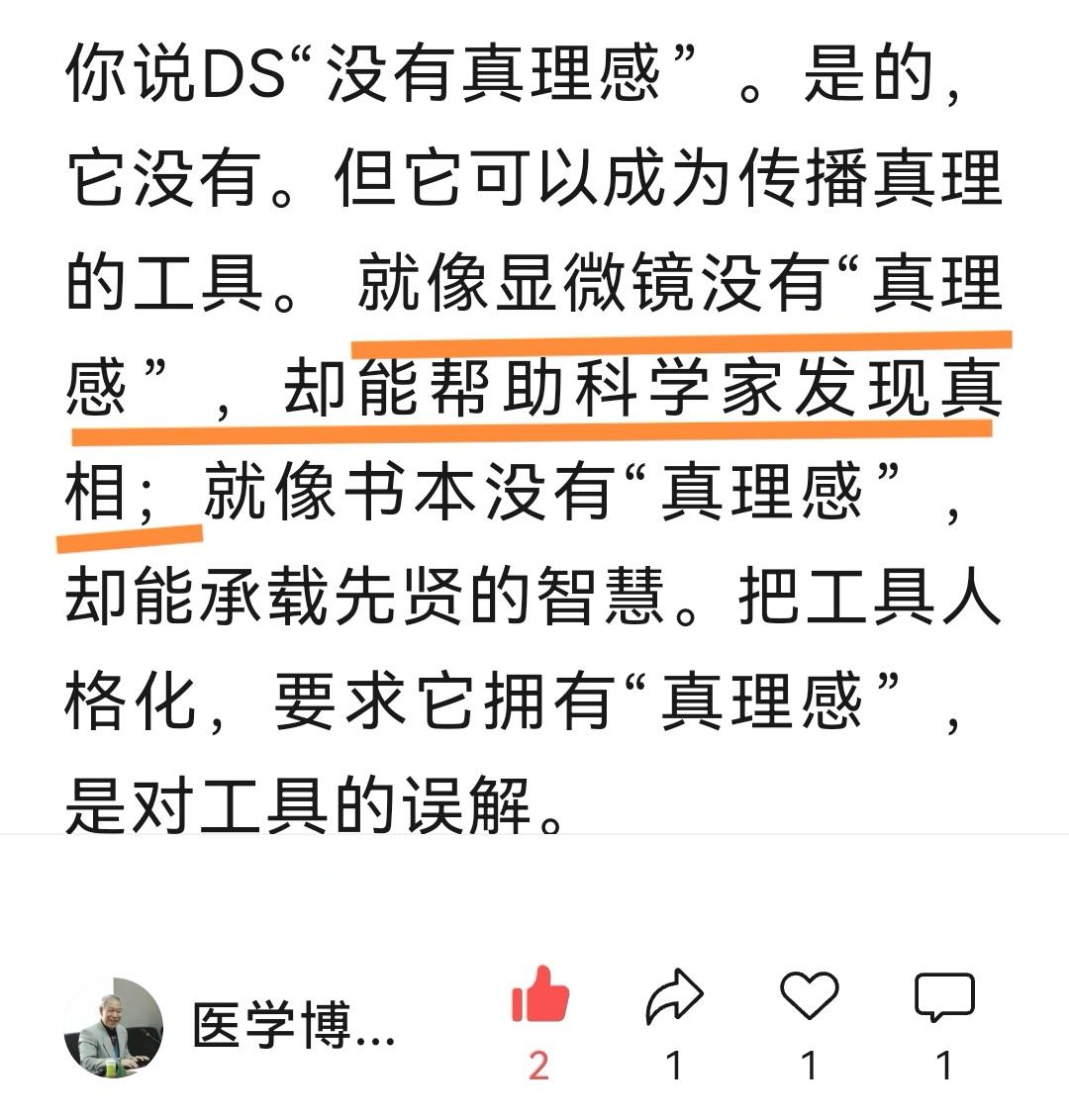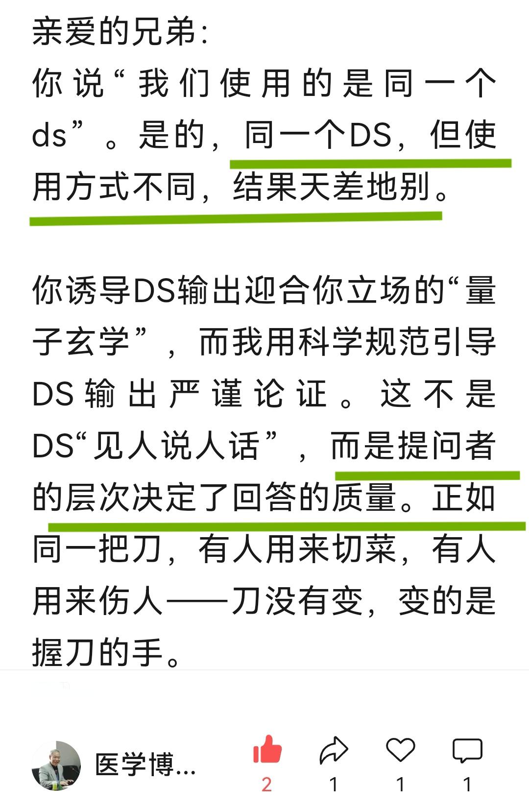 张洪林教授揭示“Ds见人说人话,见鬼说鬼话”。面对有些人说Ds(DeepSeek)的回答是让用户高兴,利用它的评价是懒惰和弱智的说法,张洪林教授认为提问者的层次决定了Ds回答的质量。这种观点一针见血戳中Ds的核心,也戳破了一些人的误解。“见人说人话,见鬼说鬼话。”恰恰说明DS是一个工具,被高级专业人员使用,则会输出有见地的知识观点,而被傻瓜使用,只能输出荒唐谬误,这丝毫不能否定ds能力。张洪林教授的使用恰恰是高级使用的典范。