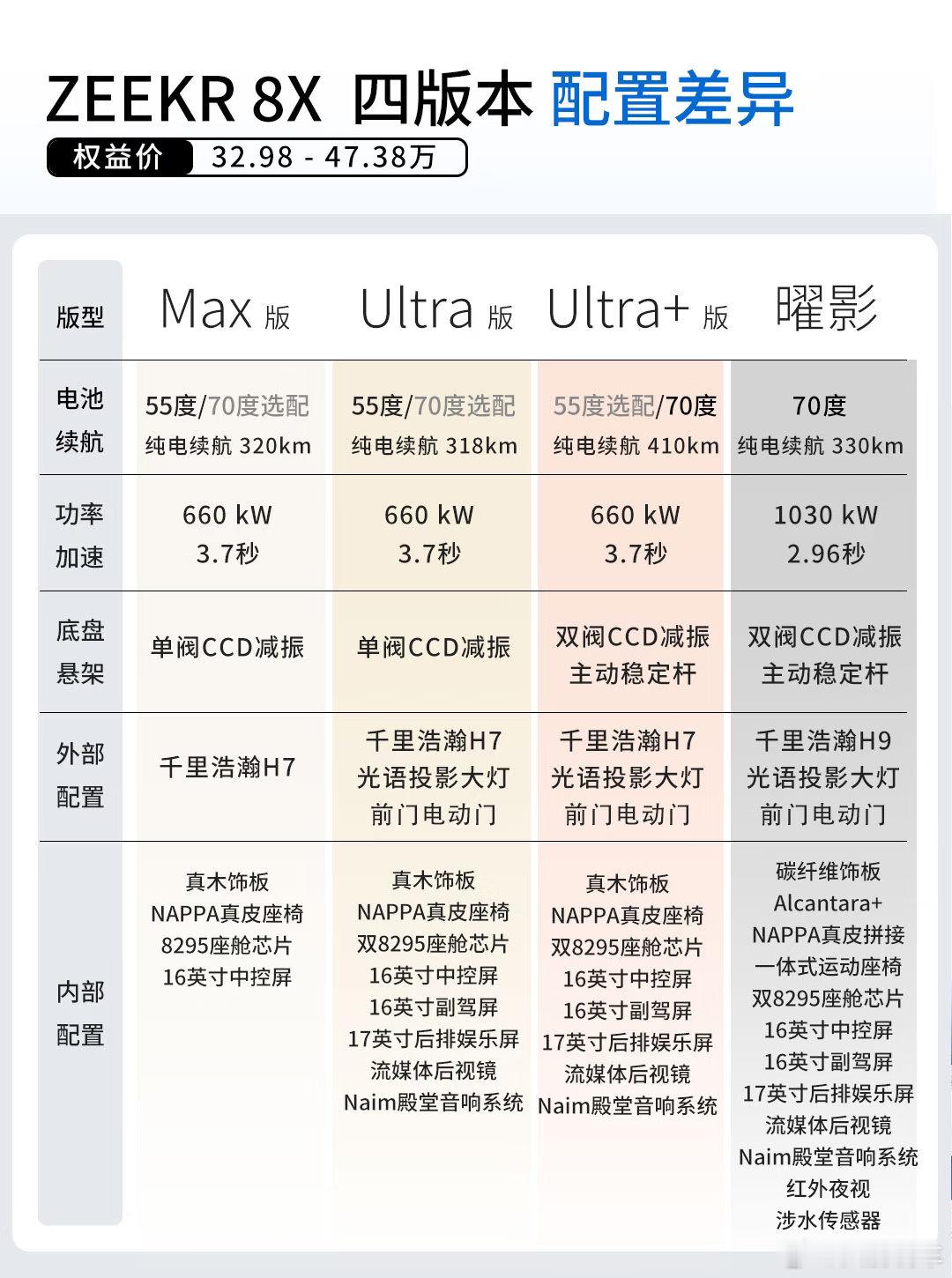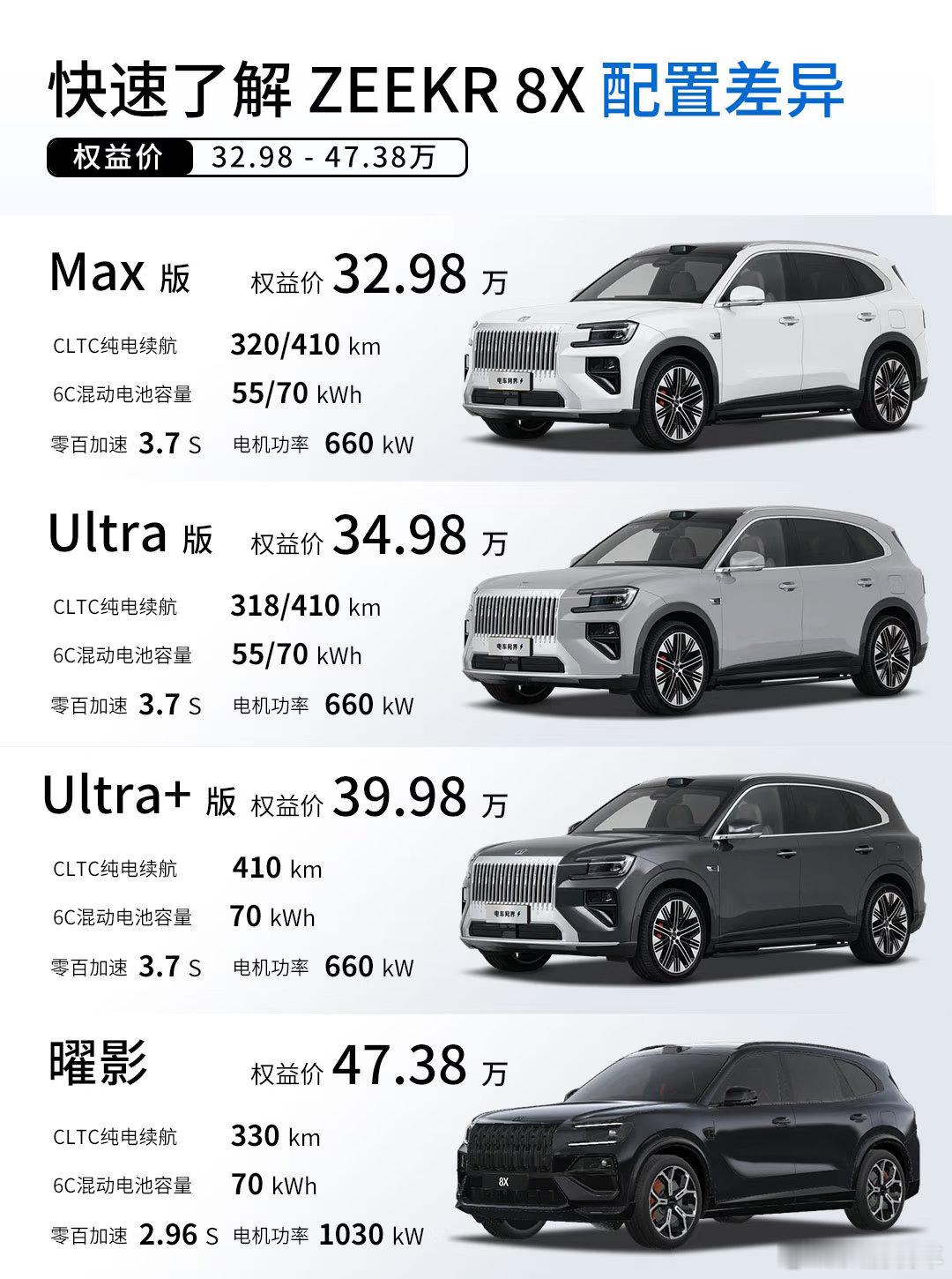 极氪8X正式上市,限时权益价32.98万元(原价35.68万元),顶配曜影版47.38万元(原价50.08万元)。这个价格比预售价真的降了好多。采用浩瀚-S超级电混架构,全系标配900V高压平台和6C超快充技术。从20%电量充到80%只需要9分钟。双电机版零百加速3.7秒;顶配曜影版更猛,三电机加兆瓦电驱,1400匹马力,2.96秒破百。作为性能旗舰,配置自然不会低,座椅能调到137度,二排伊姆斯躺椅是标配;音响Naim牌除了最低配都会送;后排还有17英寸吸顶屏。加上闭式双腔空气悬架和主动稳定杆,开起来应该很不错,这个价格你觉得性价比如何?极氪8X 极氪 8X 极氪汽车 宝藏新车 RCC飞驰计划 玩车无格式 宝藏新车