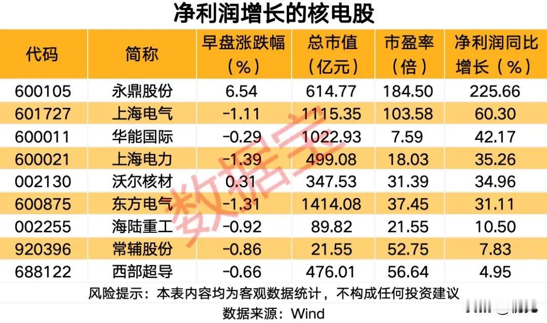 回顾4月17日盘中直击:核电装机登顶全球!9只业绩兑现股名单出炉! 根据中国核能行业协会发布的《中国核能发展报告2026》,截至目前我国商运核电机组60台、在建36台,在建规模占全球一半以上,核准待建机组16台,总装机容量达1.25亿千瓦,居全球第一;2025年核电工程建设投资完成额1610亿元,创历史新高,今年已开工2台机组、将建成7台,在建规模持续领跑全球。政策端,我国加入《三倍核能宣言》,明确助力全球净零排放目标;行业端,核电全生命周期碳排放仅12.2克/千瓦时,低碳优势显著,成为能源转型的重要支撑。全球层面,国际能源署数据显示,全球在建核电装机容量已达约70吉瓦,创40年新高,行业进入新一轮扩张周期。A股市场中,42家核电产业链上市公司里,28家发布了2025年业绩公告,其中9家实现净利润同比增长,板块景气度已从行业端传导至企业端,业绩兑现趋势明确。 个股梳理分析 1. 永鼎股份:早盘涨幅6.54%,总市值614.77亿元,市盈率184.50倍,2025年净利润同比增长225.66%,为本次榜单中业绩增速最高的标的。公司旗下东部超导主营第二代高温超导带材及超导应用产品,核心产品可应用于可控核聚变托卡马克设备,深度绑定核电前沿技术路线,叠加超导产业政策催化,业绩大幅兑现,早盘领涨核电板块。 2. 上海电气:早盘跌幅1.11%,总市值1115.35亿元,市盈率103.58倍,2025年净利润同比增长60.30%,归母净利润12.06亿元创近5年新高。作为国内核电设备龙头企业,2025年核电设备新增订单达98.9亿元,可为四代核电关键堆型提供核心主设备,是核电产业链的核心供应商,受益于核电建设提速,业绩兑现明确。 3. 华能国际:早盘跌幅0.29%,总市值1022.93亿元,市盈率7.59倍,2025年净利润同比增长42.17%。作为国内大型电力央企,公司深度布局核电运营业务,是国内核电装机规模领先的运营商之一,受益于核电装机扩容与清洁能源电价政策,业绩稳步增长,同时估值处于行业低位,具备较高安全边际。 4. 上海电力:早盘跌幅1.39%,总市值499.08亿元,市盈率18.03倍,2025年净利润同比增长35.26%。公司聚焦清洁能源运营,核电业务是其核心板块之一,依托核电项目稳定的现金流与低碳属性,受益于能源转型背景下核电装机规模扩大,业绩实现同比增长,早盘随板块整体小幅回调。 5. 沃尔核材:早盘涨幅0.31%,总市值347.53亿元,市盈率31.39倍,2025年净利润同比增长34.96%。公司主营核级辐射改性新材料,产品广泛应用于核电设备的绝缘、防护等关键环节,是核电产业链的核心材料供应商,受益于核电项目建设加速,下游需求放量带动业绩稳步提升,早盘小幅收涨。 6. 东方电气:早盘跌幅1.31%,总市值1414.08亿元,市盈率37.45倍,2025年净利润同比增长31.11%。作为国内核电设备核心龙头,公司可提供核电反应堆压力容器、蒸汽发生器等关键设备,覆盖三代、四代核电全技术路线,受益于核电新增装机提速,充足订单带动业绩兑现,早盘随市场波动小幅回调。 7. 海陆重工:早盘跌幅0.92%,总市值89.82亿元,市盈率21.55倍,2025年净利润同比增长10.50%。公司主营核电压力容器、核级换热器等关键设备,是核电产业链的细分设备供应商,产品应用于国内多个重点核电项目,受益于核电建设持续推进,下游订单支撑业绩实现小幅增长,早盘随板块波动调整。 8. 常辅股份:早盘跌幅0.86%,总市值21.55亿元,市盈率52.75倍,2025年净利润同比增长7.83%。公司主营核电阀门驱动装置,是核电设备的关键配套商,产品为核电系统提供精准控制与调节支持,受益于核电行业发展带来的配套需求增长,业绩实现小幅同比增长,早盘小幅下跌。 9. 西部超导:早盘跌幅0.66%,总市值476.01亿元,市盈率56.64倍,2025年净利润同比增长4.95%。公司主营低温超导材料,产品可应用于核电、核聚变相关设备的核心部件,是核电前沿技术路线的重要材料供应商,受益于核电产业链整体发展,需求稳步增长带动业绩小幅提升,早盘随板块回调。 总结 整体来看,核电行业正处于政策、需求、技术三重驱动的扩张周期,装机扩容与低碳转型带来的长期成长逻辑清晰,产业链上市公司业绩已进入兑现期。本次梳理从设备龙头到材料、配套、运营标的均实现业绩增长,板块景气度已传导至全产业链,行业确定性持续增强。 本文涉及资讯内容来自网络公共信息,仅供参考不构成投资建议!