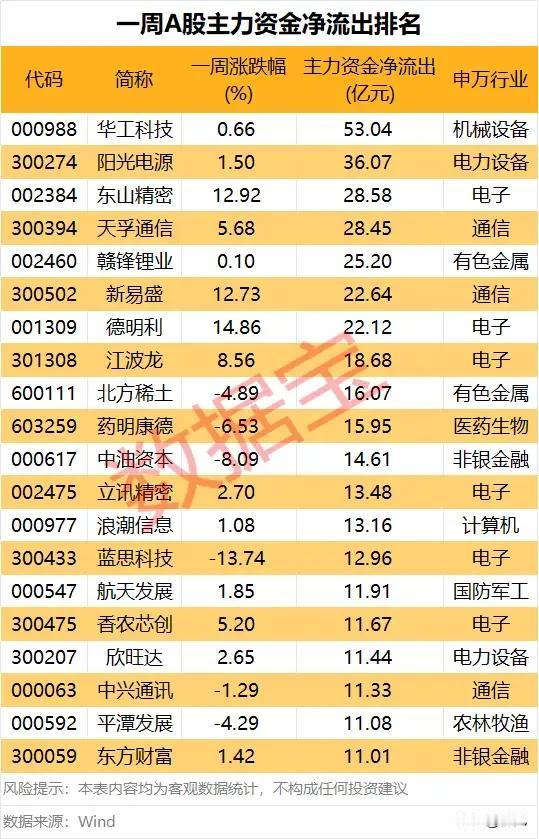 最高出逃超53亿!一周A股主力资金净流出TOP20个股盘点! 本次梳理为本周A股主力资金净流出排名前20的个股,华工科技以53.04亿元净流出额领跑,阳光电源、东山精密紧随其后。行业分布上,电子行业占据6席,通信、电力设备、有色金属等板块亦有多只标的入围。个股表现分化显著,既有股价大涨却遭资金高位兑现的标的,也有随行业景气度承压持续回调的个股,反映出市场资金在结构性行情中的分歧与避险倾向。 个股梳理分析 1. 华工科技,一周涨0.66%,主力净流出53.04亿元,属机械设备行业。作为激光设备龙头,虽小幅上涨,但遭主力大幅抛售,资金高位兑现特征明显。 2. 阳光电源,一周涨1.50%,主力净流出36.07亿元,属电力设备行业。光伏逆变器龙头,本周小幅上涨却遭大额资金撤离,市场对行业景气度存分歧。 3. 东山精密,一周涨12.92%,主力净流出28.58亿元,属电子行业。消费电子与PCB龙头,本周股价大涨,主力借高涨幅大幅获利了结离场。 4. 天孚通信,一周涨5.68%,主力净流出28.45亿元,属通信行业。光模块核心标的,本周股价上行,资金高位兑现意愿强烈,遭大额抛售。 5. 赣锋锂业,一周涨0.10%,主力净流出25.20亿元,属有色金属行业。锂矿龙头,本周股价近乎持平,主力资金大幅撤离,对锂价走势存担忧。 6. 新易盛,一周涨12.73%,主力净流出22.64亿元,属通信行业。光模块企业,本周股价大涨,主力借市场热度高位兑现,资金大幅流出。 7. 德明利,一周涨14.86%,主力净流出22.12亿元,属电子行业。存储芯片企业,本周股价大幅上涨,主力逢高获利了结,遭大额资金撤离。 8. 江波龙,一周涨8.56%,主力净流出18.68亿元,属电子行业。存储模块龙头,本周股价上行,主力借板块热度兑现浮盈,资金大幅流出。 9. 北方稀土,一周跌4.89%,主力净流出16.07亿元,属有色金属行业。稀土行业龙头,本周股价下跌,主力资金持续撤离,行业景气度承压。 10. 药明康德,一周跌6.53%,主力净流出15.95亿元,属医药生物行业。CXO龙头,本周股价大幅回调,遭主力大额抛售,市场对行业前景存担忧。 11. 中油资本,一周跌8.09%,主力净流出14.61亿元,属非银金融行业。金融控股平台,本周股价大跌,主力资金持续撤离,市场情绪低迷。 12. 立讯精密,一周涨2.70%,主力净流出13.48亿元,属电子行业。消费电子龙头,本周小幅上涨,主力资金借反弹高位兑现,遭大额流出。 13. 浪潮信息,一周涨1.08%,主力净流出13.16亿元,属计算机行业。AI服务器龙头,本周小幅上涨,主力资金撤离,市场对AI板块热度存分歧。 14. 蓝思科技,一周跌13.74%,主力净流出12.96亿元,属电子行业。消费电子防护玻璃龙头,本周股价大幅下跌,遭主力持续抛售。 15. 航天发展,一周涨1.85%,主力净流出11.91亿元,属国防军工行业。军工电子企业,本周小幅上涨,主力资金借反弹离场,遭大额流出。 16. 香农芯创,一周涨5.20%,主力净流出11.67亿元,属电子行业。半导体分销企业,本周股价上行,主力借板块热度兑现,资金大幅流出。 17. 欣旺达,一周涨2.65%,主力净流出11.44亿元,属电力设备行业。动力电池企业,本周小幅上涨,主力资金撤离,市场对行业竞争格局存担忧。 18. 中兴通讯,一周跌1.29%,主力净流出11.33亿元,属通信行业。通信设备龙头,本周股价回调,遭主力资金持续撤离。 19. 平潭发展,一周跌4.29%,主力净流出11.08亿元,属农林牧渔行业。主营林木与生物燃料,本周股价下跌,遭主力资金大幅抛售。 20. 东方财富,一周涨1.42%,主力净流出11.01亿元,属非银金融行业。互联网券商龙头,本周小幅上涨,主力资金借市场热度高位兑现。 总结 整体来看,本周主力资金净流出TOP20个股集中于电子、通信、电力设备等高景气赛道,多数标的在股价上涨时遭资金高位兑现,部分标的因行业景气度担忧或基本面分歧持续承压。这反映出市场资金在结构性行情中,对高位标的的获利了结意愿强烈,同时对部分赛道的前景存在分歧,避险情绪有所升温。 本文涉及资讯内容来自网络公共信息,仅供参考不构成投资建议!