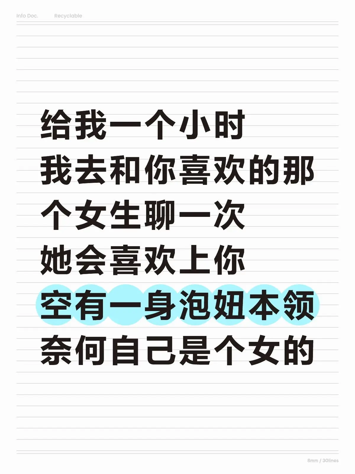 全网蹲一位,不会追女生,嘴笨,不会聊天。不善于推进关系的兄弟。我可太想...