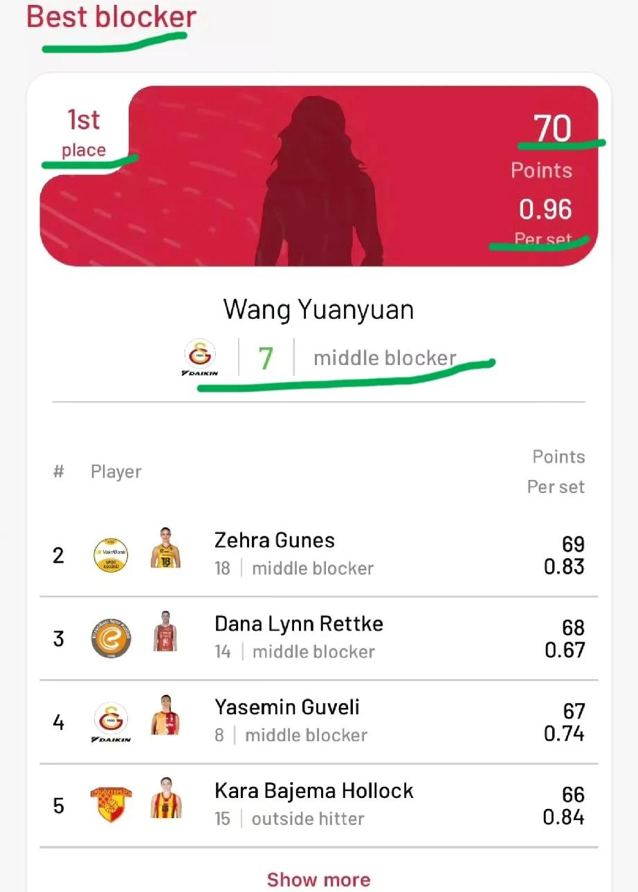 王媛媛今天登顶土超联赛榜首!今天副攻王媛媛在土耳其联赛再一次创造历史,副攻王媛媛第一次登顶土超联赛的拦网榜单的第一名位置! 在土耳其联赛拦网榜单上,副攻王媛媛拦网直接得分高达70分,高高排名第一位置!比第二名高了两分!副攻王媛媛的局平均拦网得分0.96分,也是排名第一位置!副攻王媛媛成功登顶副攻拦网榜的第一名!副攻王媛媛的拦网monster block 真是太厉害了!中国女排的网上长城真是名不虚传啊! 今天凌晨的土超女排5/6名决赛首回合较比赛,副攻王媛媛拿到全队第2高分17分,帮助加拉塔萨雷客场3-1击败阿拉斯货运,在三场两胜制的比赛中旗开得胜。 本场比赛副攻王媛媛凭贡献单场4拦!副攻在拦网榜上上升至拦网得分榜首位(局均第1)。本场比赛王媛媛4局17分(16扣11中1失误0被拦,2发4拦)! 副攻王媛媛在土耳其第一次拿到欧联杯冠军后,再一次在留洋生涯中创造历史奇迹!副攻王媛媛登顶土超联赛的拦网榜第一名位置!拦网榜可是评价副攻是否成功的最重要的指标!王媛媛登顶拦网榜第一名,说明副攻王媛媛是土超联赛最优秀的副攻!天涯体育排球讯