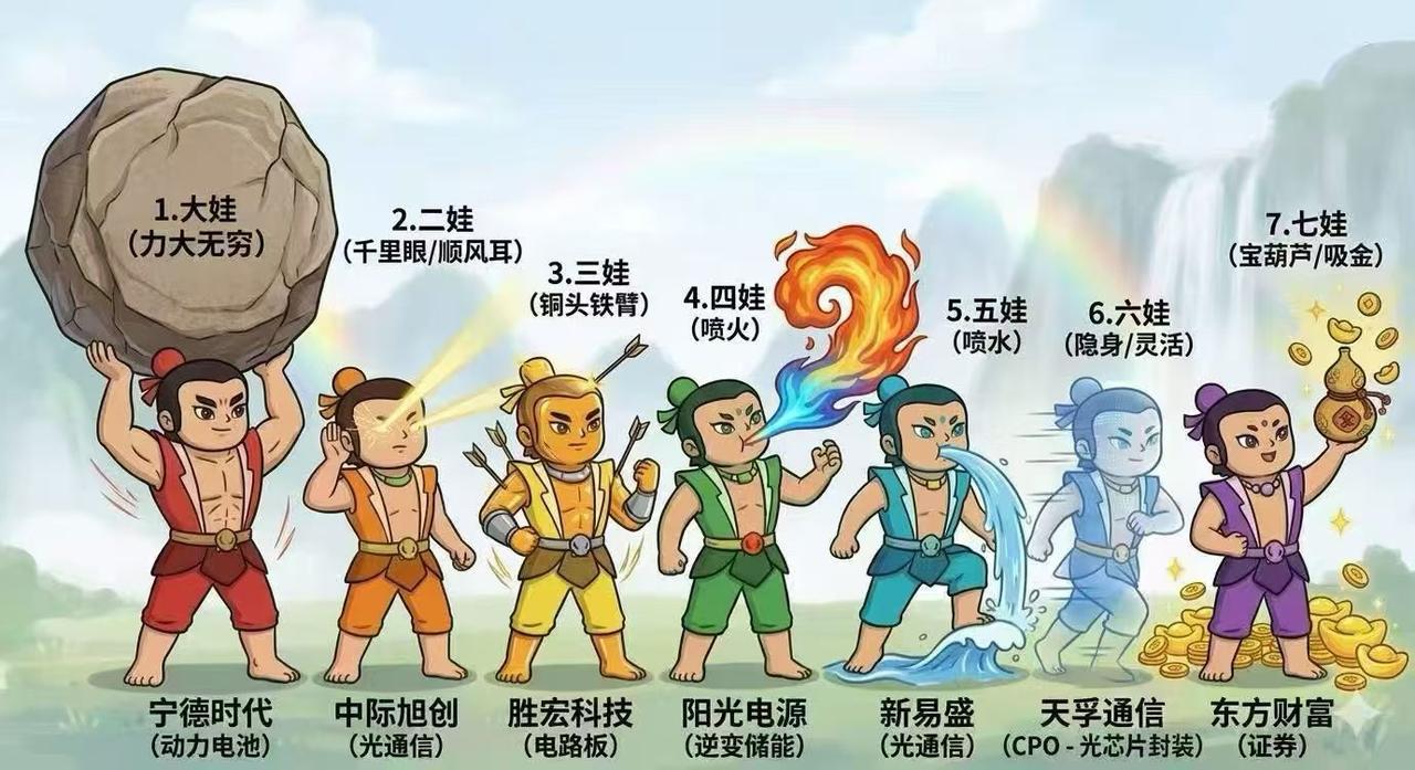 光伏新能源版葫芦娃,你看懂了吗? 童年的葫芦七兄弟,现在成了A股新能源赛道的“全明星阵容”,每一个都对应着产业链上的龙头! 大娃力大无穷→宁德时代,动力电池的扛把子,撑起了新能源的基本盘。 二娃千里眼→中际旭创,光通信龙头,算力与AI时代的“顺风耳”。 三娃铜头铁臂→胜宏科技,PCB电路板龙头,新能源设备的“钢筋铁骨”。 四娃喷火→阳光电源,逆变器+储能龙头,把光变成稳定的电力。 五娃喷水→新易盛,光模块龙头,数据传输的“水流”。 六娃隐身灵活→天孚通信,CPO光芯片封装,技术路线灵活切换。 七娃宝葫芦吸金→东方财富,券商龙头,靠新能源牛市“吸金”无数。 一条产业链,从上游到下游,分工明确,各司其职,就像葫芦兄弟合体,撑起了整个新能源的“通天大道”。 你最看好哪个“葫芦娃”? 新能源 A股 产业链