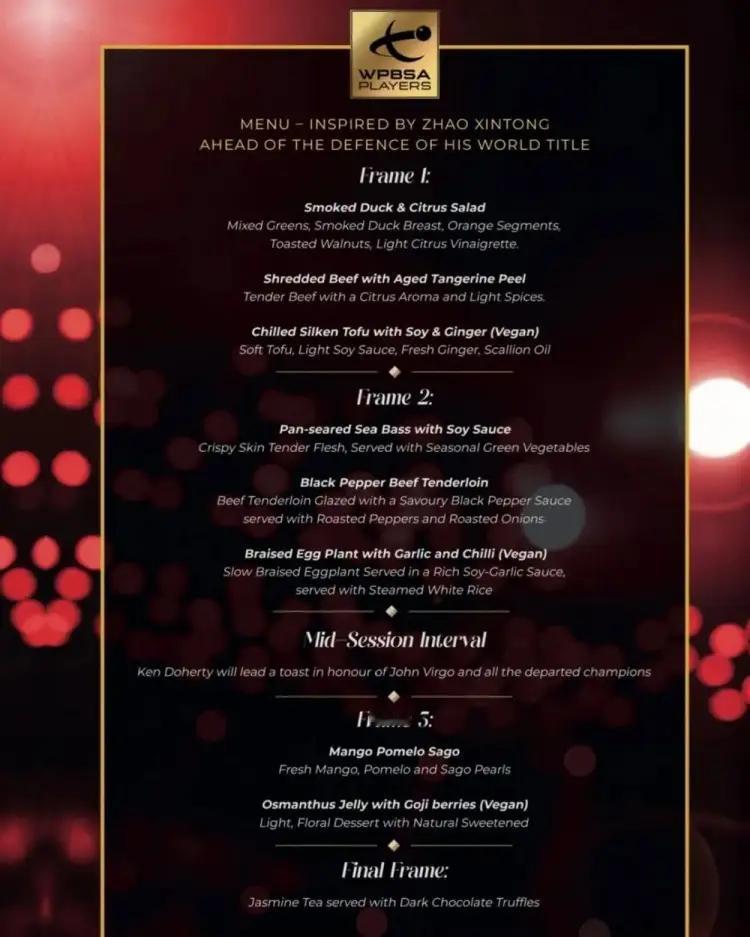 世界冠军晚宴,出自赵心童灵感,并且由赵心童亲自设计,具备浓厚的东方韵味,并且以斯诺克的局数(frame)划分上菜顺序,完美贴合斯诺克世锦赛这个主题。 这个冠军晚宴是世锦赛的传统保留节目,参加的人数不多,但是规格极高。必须要获得过世锦赛冠军的成员,才有资格被邀请。本次邀请了宾汉姆、罗伯逊、亨得利、墨菲、戴维斯、达赫迪等前世界冠军。之前,还没有任何一个亚洲人获得过世锦赛冠军。而这一次赵心童衣装齐整,作为卫冕冠军参加这项活动,也给一直以来的西餐带来了浓浓的中国风味。 Frame 1(第一局·前菜) 烟熏鸭胸柑橘沙拉 陈皮牛肉丝 姜汁凉拌嫩豆腐(纯素) Frame 2(第二局·主菜) 酱煎海鲈鱼 黑椒牛柳 蒜香辣椒烧茄子(纯素) 局间休息(Mid-Session Interval) 肯·多尔蒂将带领全场举杯,致敬传奇名宿约翰·维尔戈,以及所有离世的世锦赛冠军 Frame 5(第五局·甜品) 芒果西柚西米露 枸杞桂花果冻(纯素) Final Frame(决胜局·收尾) 茉莉花茶搭配黑巧克力松露 整个菜式中西融合,有鲜明的中国特色。陈皮牛肉丝,选用广东新会陈皮。烧椒茄子配一碗大白米饭。芒果西米露就是经典中式杨枝甘露等等。菜式分第一局、第二局一直到决胜局,巧妙的和斯诺克项目进行了融合。 这是斯诺克官方为中国籍卫冕冠军量身打造的整套中式晚宴,排面直接拉满。 期望赵心童今年能够卫冕成功,或者其他的中国伙伴夺冠,让斯诺克冠军们明年能够再次品尝中国味道!