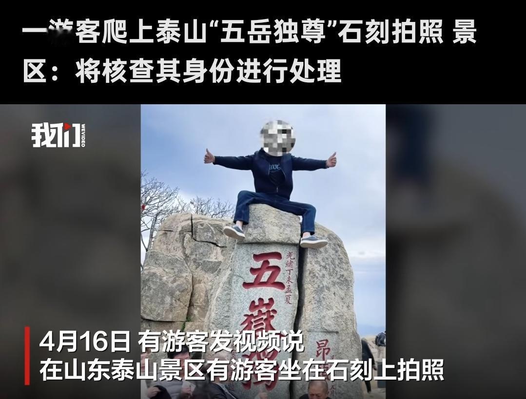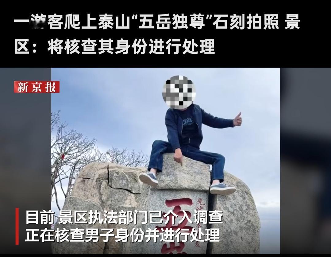 这位大兄弟,“五岳独尊” 岂容你如此撒野? 4月16日,山东泰山景区里有个男游客火了。火的原因不是他做了啥感人事迹,而是他竟然大摇大摆地坐在了泰山顶上那块著名的“五岳独尊”石刻上面! 这哥们儿不光坐上去了,还摆了个大鹏展翅的pose。张开双手、叉开双腿,让同伴在底下咔嚓拍照。你是来爬泰山的,不是来给玉皇大帝当座山雕的啊! 虽然网上不少网友调侃他“八字真硬”,甚至开玩笑说“以前是泰山压顶,这小伙子是压泰山”。 但更多的网友直接怒了:这可是文物古迹啊,从小就印在5块钱人民币背面的景点,谁给你的权利站上去撒野? 4月17日,景区回应了。泰山风景名胜区明确表示禁止游客攀爬石刻,而且景区执法部门已经介入调查,要核查这人的身份进行相应处理。 景区还说会在附近安装监控设备、加派人手巡查。可以说,这一系列回应就是动真格了。 说实话,有些游客出去旅游,总觉得“我来都来了,必须踩上去拍个照才算完”。这又不是2020年第一次出现这种事儿了! 要知道,泰山自古以来就是中国文化的精神丰碑,连皇帝上去都得徒步,你这直接一脚踩在“五岳独尊”上,算啥本事? 咱们去旅游是去欣赏美景、感受文化的,不是去糟蹋景点的。现在监控一装,执法部门介入调查,这位兄弟可能要为自己的“名场面”买单了。 最后说一句:泰山顶上风景美,五岳独尊见证了你到此一游。但记住,管好自己的脚,别踩在老祖宗留下的宝贵财富上撒野!