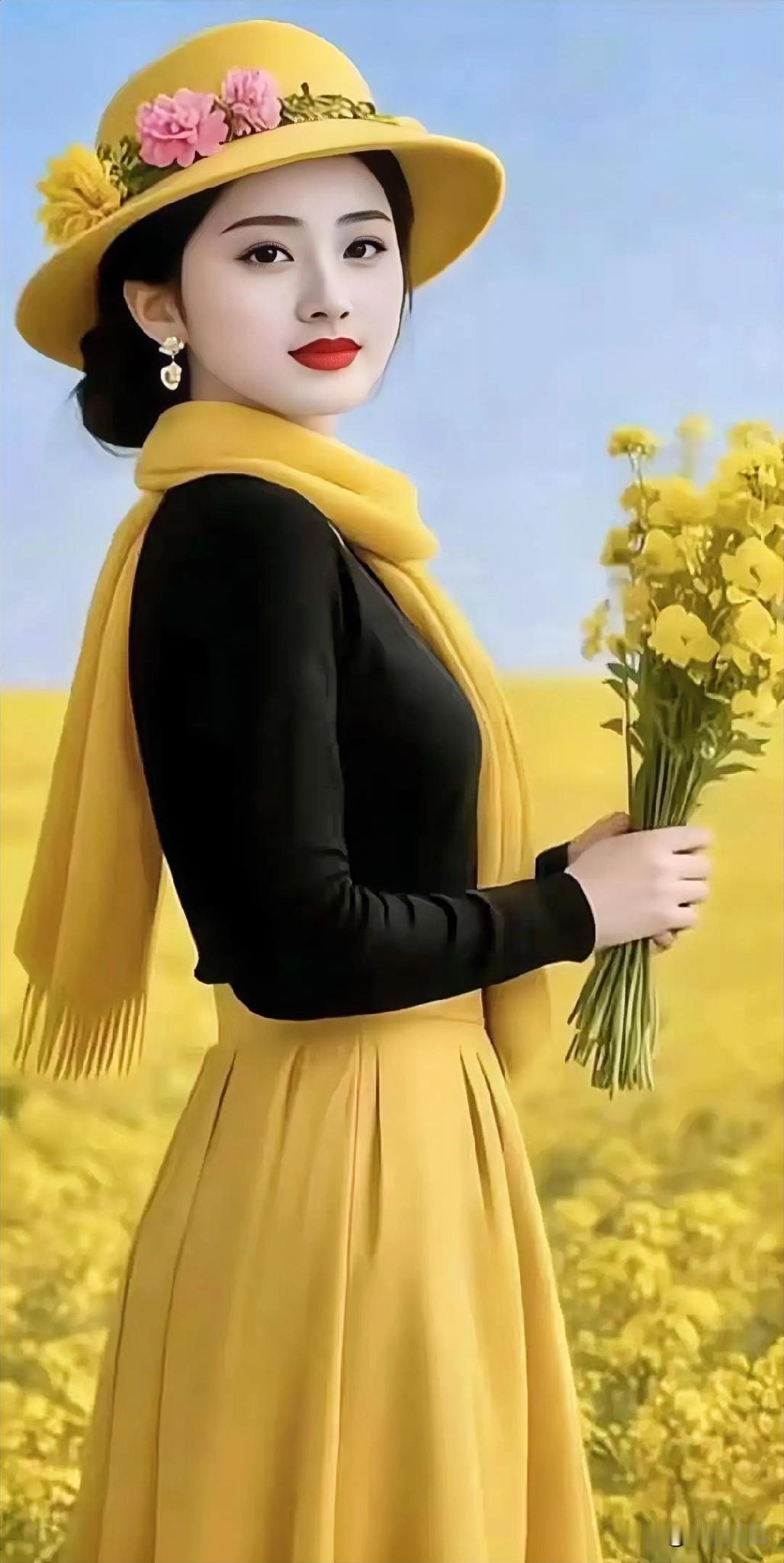 一位身着黄色裙子的女孩亭亭玉立在花田之中。黄裙花丛照 随性黄衣女生 黄衣小女孩 梦幻黄裙少女 黄色花海服饰
