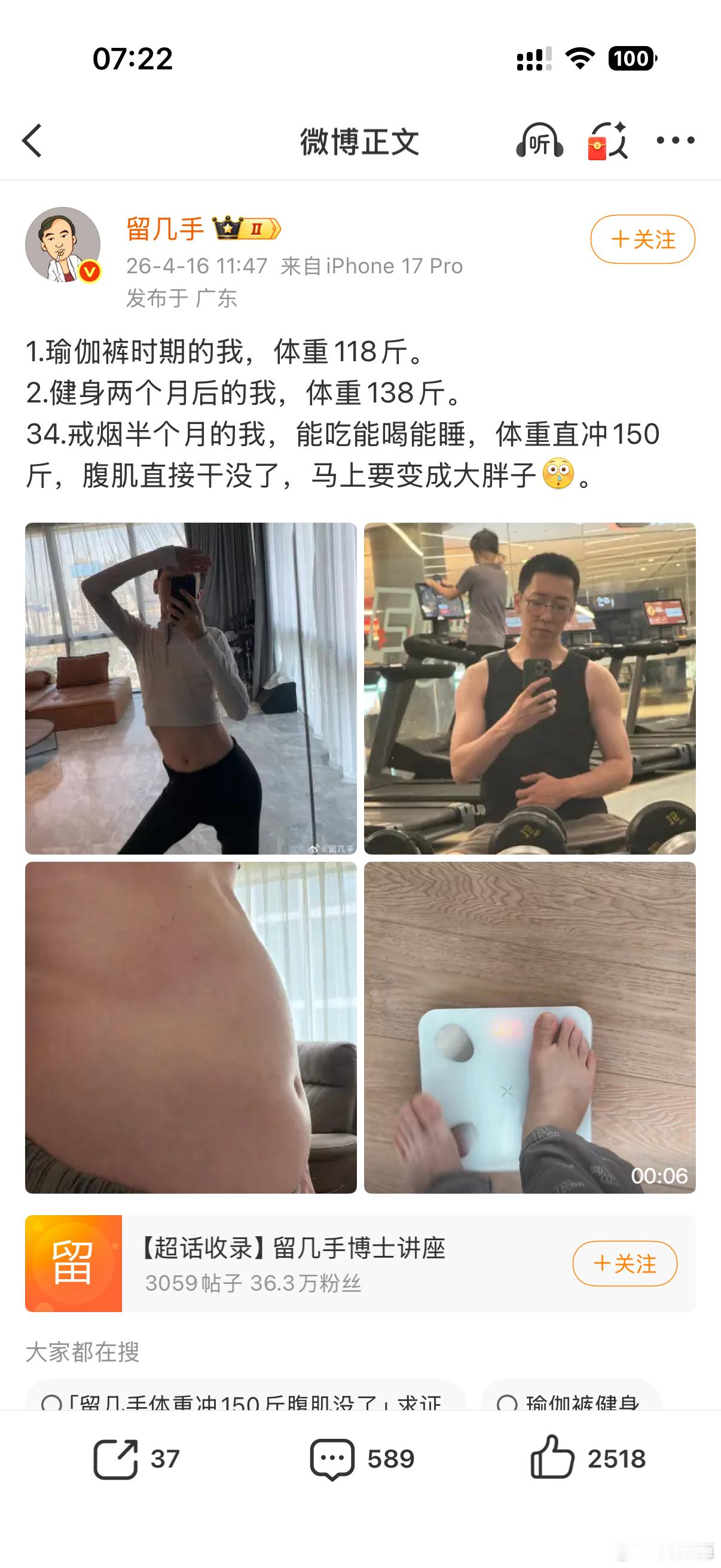 留几手胖了12斤留几手戒烟后体重暴涨 留几手发文:1.瑜伽裤时期的我,体重118斤。2.健身两个月后的我,体重138斤。3.戒烟半个月的我,能吃能喝能睡,体重直冲150斤,腹肌直接干没了,马上要变成大胖子。