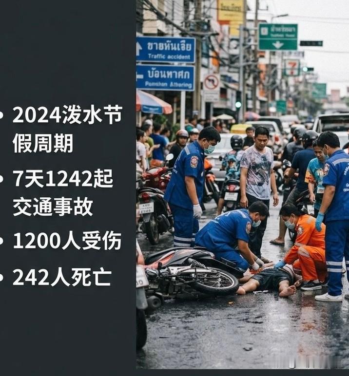 每年泰国泼水节(宋干节),本该是全民祈福、欢乐玩水的节日,却屡屡变成交通事故高发的“危险时段”,伤亡数据让人揪心。 根据2026年泰国防灾减灾厅官方统计,4月10日至16日泼水节假期期间,泰国全国累计发生1242起交通事故,造成1200人受伤、242人不幸身亡,日均有超30人因交通事故失去生命,其中4月16日单日事故量达到峰值,242起事故、32人死亡,触目惊心。 深究事故原因,酒驾、超速是头号元凶,两项违规行为占比接近七成,再加上摩托车出行占比超67%,不少人狂欢后疲劳驾驶、不遵守交通规则,年轻人更是成为伤亡高发群体。曼谷、清莱等热门旅游城市,事故数量也始终居高不下。 对比往年数据,今年伤亡人数虽有小幅下降,但依旧处于高位,泼水节的道路安全问题,早已成为泰国亟待解决的公共安全难题。 在此也提醒计划前往泰国旅游的朋友,出行务必遵守当地交规,拒绝酒驾、超速,乘坐摩托车务必戴好头盔,平安才是节日最美的底色,千万别让欢乐变成悲剧。