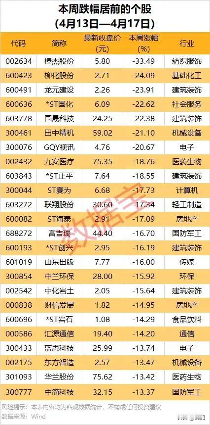 本周(4.13-4.17)这些个股深度回调! 行业分布上,建筑装饰板块合计5只个股入围,是本周调整幅度最大的板块;ST类个股共6只上榜,占比达四分之一,成为下跌核心主力;医药生物、电子、机械设备、房地产等板块亦有多只标的深度回调,整体呈现风险集中释放、弱势板块与高风险标的持续承压的特征。 个股梳理分析 1. 棒杰股份,最新收盘价5.80元,本周跌幅33.49%,所属纺织服饰行业。公司主营光伏电池与纺织业务,本周板块景气度走弱,股价大幅领跌。 2. 柳化股份,最新收盘价2.71元,本周跌幅24.09%,所属基础化工行业。公司主营化肥化工产品生产,本周细分赛道需求疲软。 3. 龙元建设,最新收盘价2.26元,本周跌幅23.91%,所属建筑装饰行业。公司主营工程施工基建业务,本周行业订单不及预期,股价深度调整。 4. *ST国化,最新收盘价6.09元,本周跌幅22.62%,所属社会服务行业。公司主营园区运营相关服务,本周退市风险预期升温。 5. 国晟科技,最新收盘价24.25元,本周跌幅22.38%,所属建筑装饰行业。公司主营建筑智能化工程,本周板块整体走弱。 6. 田中精机,最新收盘价59.02元,本周跌幅21.10%,所属机械设备行业。公司主营数控自动化设备,本周消费电子设备需求疲软。 7. GQY视讯,最新收盘价4.76元,本周跌幅20.67%,所属电子行业。公司主营大屏显示视讯产品,本周行业需求不及预期。 8. 九安医疗,最新收盘价75.35元,本周跌幅18.76%,所属医药生物行业。公司主营家用医疗检测产品,本周业绩预期走弱,股价深度回调。 9. *ST正平,最新收盘价7.64元,本周跌幅18.55%,所属建筑装饰行业。公司主营路桥工程施工,本周退市风险担忧加剧,股价大幅下挫。 10. ST赛为,最新收盘价6.68元,本周跌幅17.73%,所属计算机行业。公司主营智慧城市与AI业务,本周板块资金流出,股价持续走弱。 11. 联翔股份,最新收盘价30.60元,本周跌幅17.34%,所属轻工制造行业。公司主营墙布装饰产品,本周家居消费需求疲软,股价大幅回调。 12. ST海泰,最新收盘价2.91元,本周跌幅17.09%,所属房地产行业。公司主营地产开发园区运营,本周地产板块持续承压,股价震荡下行。 13. 富吉瑞,最新收盘价44.40元,本周跌幅16.70%,所属国防军工行业。公司主营红外热成像产品,本周军工板块资金流出,股价大幅调整。 14. *ST创兴,最新收盘价2.95元,本周跌幅16.19%,所属建筑装饰行业。公司主营建筑装饰相关业务,本周退市风险预期升温,股价持续下跌。 15. 山东出版,最新收盘价7.77元,本周跌幅16.00%,所属传媒行业。公司主营图书出版发行业务,本周传媒板块热度退潮。 16. 中兰环保,最新收盘价28.00元,本周跌幅15.92%,所属环保行业。公司主营固废处置污染治理,本周环保板块景气度走弱。 17. 中化岩土,最新收盘价2.05元,本周跌幅15.64%,所属建筑装饰行业。公司主营岩土工程基建业务,本周行业需求疲软。 18. 财信发展,最新收盘价1.82元,本周跌幅14.95%,所属房地产行业。公司主营地产开发环保业务,本周房企资金面担忧加剧。 19. *ST岩石,最新收盘价1.08元,本周跌幅14.29%,所属食品饮料行业。公司主营白酒相关业务,本周退市风险高企,股价持续大幅下行。 20. 汇源通信,最新收盘价19.40元,本周跌幅14.20%,所属通信行业。公司主营通信设备系统服务,本周通信板块资金流出。 21. 蓝思科技,最新收盘价25.99元,本周跌幅13.74%,所属电子行业。公司主营消费电子防护玻璃,本周消费电子需求不及预期,股价震荡回调。 22. 东方智造,最新收盘价2.57元,本周跌幅13.47%,所属机械设备行业。公司主营智能测控装备,本周板块整体走弱。 23. 华兰股份,最新收盘价75.62元,本周跌幅13.42%,所属医药生物行业。公司主营药用包装材料,本周医药板块整体承压。 24. 中简科技,最新收盘价32.15元,本周跌幅13.37%,所属国防军工行业。公司主营高性能碳纤维产品,本周军工板块热度退潮,股价震荡下行。 总结 本周跌幅居前个股集中于建筑装饰板块与ST类标的,充分反映出市场对业绩承压、存在退市风险标的的强烈规避情绪。医药生物、电子、房地产等板块的多只个股同步走弱,与同期高景气成长赛道的强势表现形成鲜明对比,凸显出A股市场极致的结构性分化特征。整体来看,本周市场资金避险情绪升温,偏好集中于业绩确定性强、景气度高的成长方向,对基本面疲软、存在潜在风险的标的持续抛售,风险释放特征显著。 本文涉及资讯内容来自网络公共信息,仅供参考不构成投资建议!