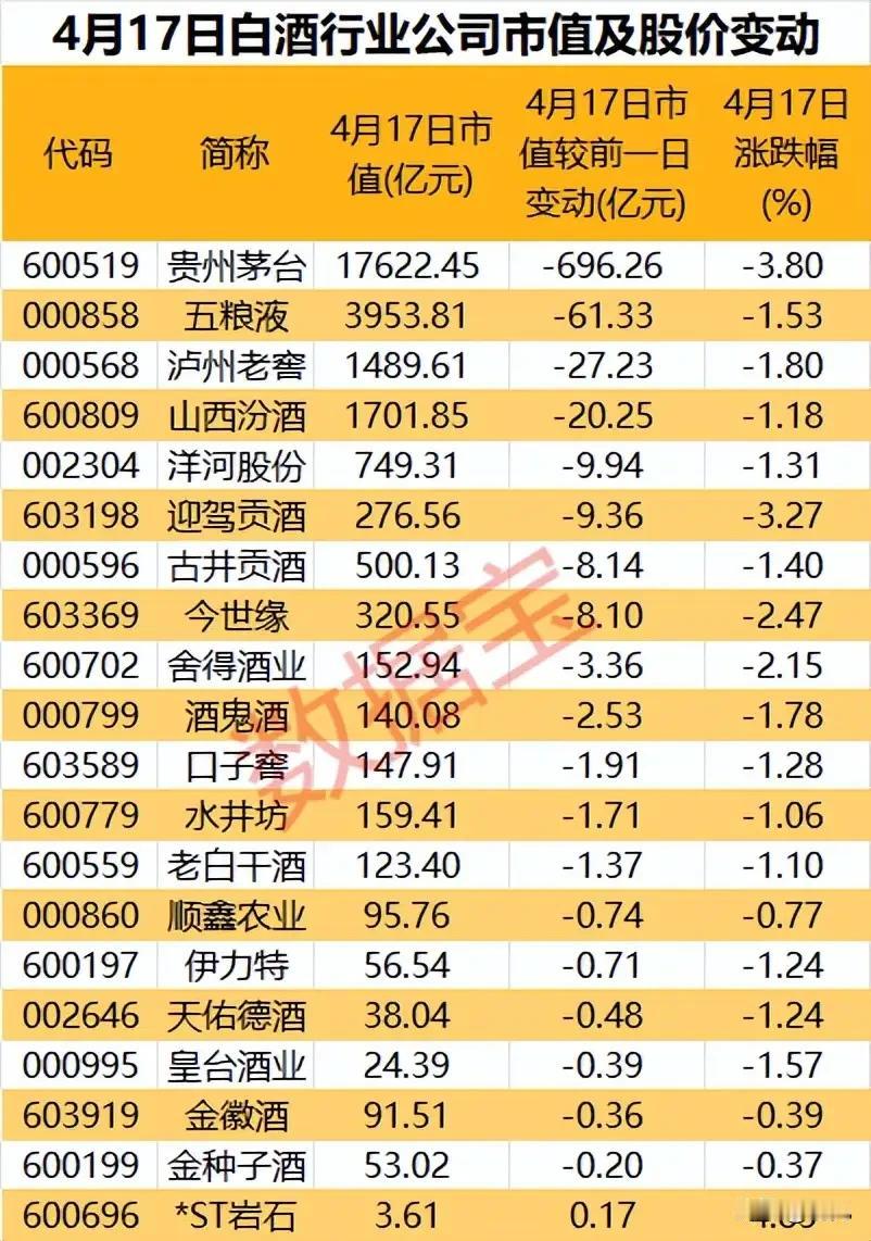 4月17日白酒行业集体回调,仅1股逆势飘红! 4月17日白酒行业整体遭遇集体回调,20只个股中仅*ST岩石逆势上涨,其余标的全部收跌,板块市值整体大幅缩水。其中,贵州茅台以3.80%的跌幅领跌,单日市值蒸发近700亿元,对板块情绪造成明显压制;迎驾贡酒、今世缘等区域酒企跌幅也相对较大,一线、次高端及区域酒企普跌,反映出市场对白酒板块短期情绪偏空,资金流出特征显著。 个股梳理分析 1. 贵州茅台,4月17日市值17622.45亿元,市值较前一日减少696.26亿元,跌幅3.80%,为当日市值蒸发最多、跌幅最大的白酒龙头,直接带动板块走弱。 2. 五粮液,4月17日市值3953.81亿元,市值较前一日减少61.33亿元,跌幅1.53%,作为行业次龙头,随板块同步回调,跌幅显著小于茅台。 3. 泸州老窖,4月17日市值1489.61亿元,市值较前一日减少27.23亿元,跌幅1.80%,当日股价小幅下跌,市值随行业整体缩水,回调幅度处于行业中等水平。 4. 山西汾酒,4月17日市值1701.85亿元,市值较前一日减少20.25亿元,跌幅1.18%,当日股价小幅回调,在一线酒企中跌幅相对温和。 5. 洋河股份,4月17日市值749.31亿元,市值较前一日减少9.94亿元,跌幅1.31%,随板块同步走弱,跌幅处于行业中等区间,股价波动幅度较小。 6. 迎驾贡酒,4月17日市值276.56亿元,市值较前一日减少9.36亿元,跌幅3.27%,为当日跌幅仅次于茅台的白酒股,区域酒企中回调幅度显著偏大。 7. 古井贡酒,4月17日市值500.13亿元,市值较前一日减少8.14亿元,跌幅1.40%,随板块集体回调,股价小幅下跌,跌幅与行业整体水平基本持平。 8. 今世缘,4月17日市值320.55亿元,市值较前一日减少8.10亿元,跌幅2.47%,当日股价回调幅度较大,市值缩水明显,在区域次高端酒企中表现偏弱。 9. 舍得酒业,4月17日市值152.94亿元,市值较前一日减少3.36亿元,跌幅2.15%,随板块同步下跌,股价回调幅度中等,资金流出特征不明显。 10. 酒鬼酒,4月17日市值140.08亿元,市值较前一日减少2.53亿元,跌幅1.78%,当日股价小幅下跌,市值随行业整体缩水,波动幅度相对温和。 11. 口子窖,4月17日市值147.91亿元,市值较前一日减少1.91亿元,跌幅1.28%,随板块回调,跌幅处于行业中等偏下水平,股价走势相对平稳。 12. 水井坊,4月17日市值159.41亿元,市值较前一日减少1.71亿元,跌幅1.06%,当日股价小幅回调,跌幅在行业中相对温和,抗跌性表现较好。 13. 老白干酒,4月17日市值123.40亿元,市值较前一日减少1.37亿元,跌幅1.10%,随板块集体走弱,股价小幅下跌,跌幅处于行业低位区间。 14. 顺鑫农业,4月17日市值95.76亿元,市值较前一日减少0.74亿元,跌幅0.77%,当日股价小幅回调,为非ST股中跌幅最小的标的,走势相对抗跌。 15. 伊力特,4月17日市值56.54亿元,市值较前一日减少0.71亿元,跌幅1.24%,随板块同步下跌,股价小幅回调,市值缩水幅度较小。 16. 天佑德酒,4月17日市值38.04亿元,市值较前一日减少0.48亿元,跌幅1.24%,当日股价小幅下跌,市值随行业整体缩水,波动幅度不大。 17. 皇台酒业,4月17日市值24.39亿元,市值较前一日减少0.39亿元,跌幅1.57%,随板块集体回调,股价小幅下跌,跌幅与行业整体水平基本一致。 18. 金徽酒,4月17日市值91.51亿元,市值较前一日减少0.36亿元,跌幅0.39%,当日股价小幅回调,跌幅处于行业低位,走势表现相对抗跌。 19. 金种子酒,4月17日市值53.02亿元,市值较前一日减少0.20亿元,跌幅0.37%,随板块走弱,股价小幅下跌,跌幅在行业中处于最低水平区间。 20. *ST岩石,4月17日市值3.61亿元,市值较前一日增加0.17亿元,涨幅4.85%,为当日白酒行业唯一逆势上涨的个股,走势独立于板块整体行情。 总结 4月17日白酒板块呈现明显的集体回调特征,除*ST岩石外所有标的均出现市值缩水与股价下跌,一线龙头茅台的大幅领跌对板块情绪形成压制,一线酒企、次高端及区域酒企普跌,反映出市场对白酒板块短期信心不足,资金整体流出明显,板块短期承压特征显著。 本文涉及资讯内容来自网络公共信息,仅供参考不构成投资建议!