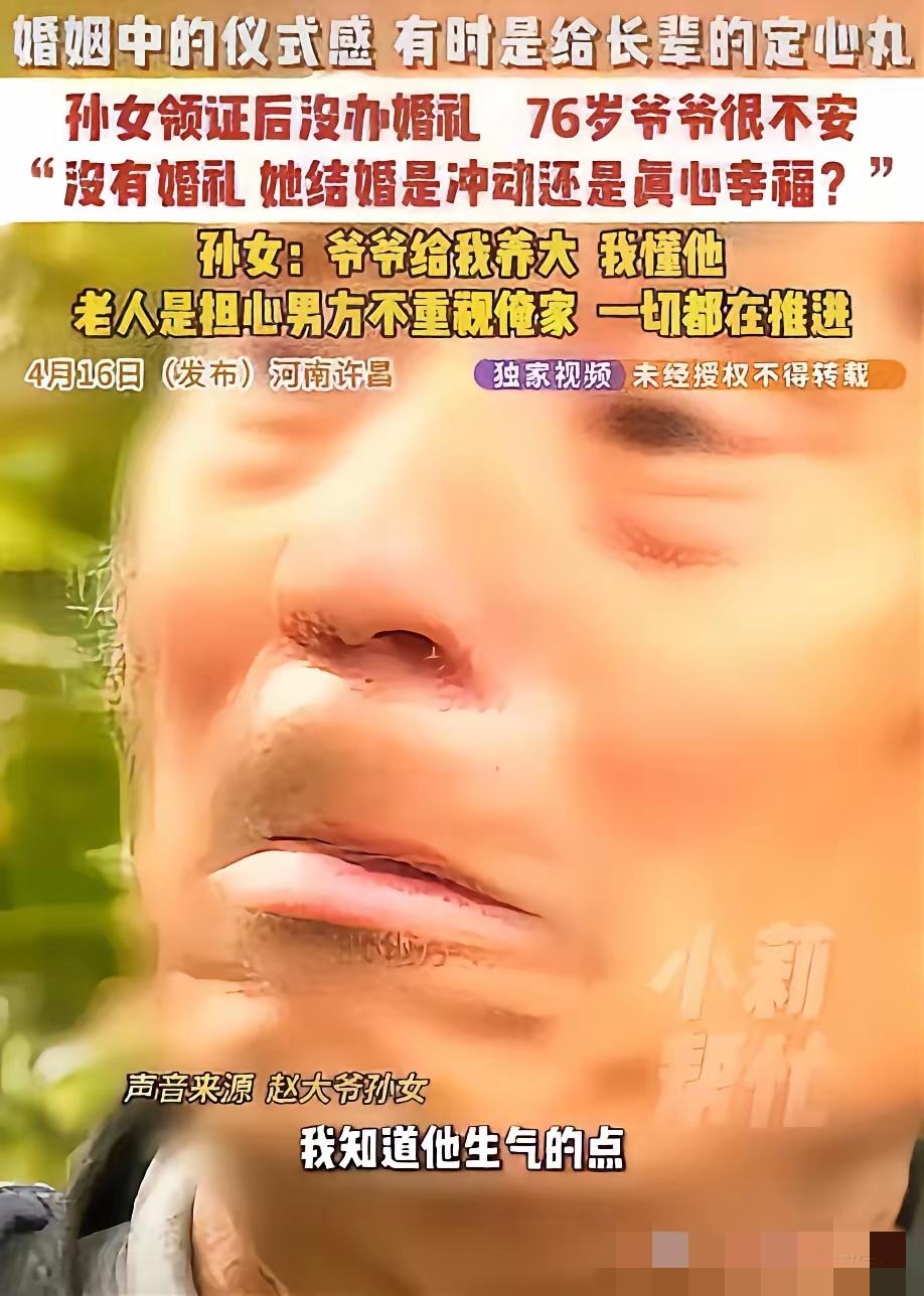 太心酸!河南禹州,20岁孙女偷偷领了结婚证,没办婚礼,没通知家人,76岁的爷爷从别人嘴里知道后,当场落了泪。他不是怪孩子,是怕:“我都没见过男方,没有婚礼没有仪式,她结婚是冲动还是真心幸福?她爸妈不管她,从小我给她养大到18岁,我害怕她以后受委屈。” 爷爷不是反对,是满心的怕。父母缺位,他一把屎一把尿把孙女拉扯大,不求彩礼不求排场,只盼孙女风风光光出嫁,被婆家真心重视。没见过男方、没仪式没交代,他怕孩子年少冲动选错人,往后受委屈连个撑腰的人都没有。 年轻人总觉得婚姻是两个人的事,忽略了长辈的牵挂从来不是束缚。仪式感不是形式,是给女孩的底气与体面,也是家人最后的安心。 好在后续双方见面,男方承诺会补办婚礼给足尊重,爷爷悬着的心终于放下。这份隔代的疼爱,才是最珍贵的守护。 你能理解爷爷的眼泪吗?