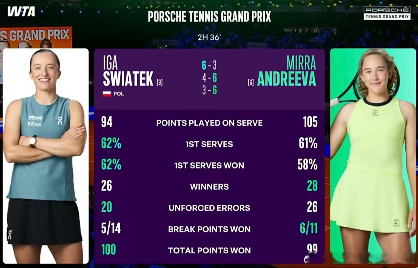 斯瓦泰克,凌晨在斯图加特500赛三盘被米拉·安德列娃逆转🔄6-3/4-6/3-6!这场比赛真的非常接近,两个人回合板数很多,很多局都是打了很久。最终的数据再度说明网球不是算总分的运动,总得分Iga 100-99 Mirra…Mirra这个红土赛季到目前为止,是成绩和状态最出色火热的,7连胜ing,拿到上周林茨冠军,这周斯图加特继续冲冠中!Iga打完了罗伊格执教后的第一站比赛,先说下这站比赛团队的情况,罗伊格教练还是蛮认真的,而且和此前教练不一样的一点,他一直在和Iga团队的老员工体能师Maciej沟通,这一点是新教练入驻后的好迹象,可缩短一定磨合期…这周父亲也一直坐在团队包厢内!另外就是经纪人小哥Jules一直在身边,这样一个四人组。对Mirra这场比赛,非常典型的一场红土对决,这也和两个人风格有关。Iga这边有几个改进的迹象:1. 比赛大部分时间真的很耐心,打出了很合理的网球 2. 正手信心在追赶反手信心,但随之导致有些回合会纠结击球选择 3. 发球是在变,抛球真的有纳达尔的影子,但发球效果还是要去提高…4.有些切削球出现,反拍随机球处理能力有增强,整体这场底线还可以的。这比赛输也是输的有意义,比赛两个关键时间节点,第二盘4-5之后发球局被带走的最后两分丢的有点恍惚;另外就是决胜盘2-0之后有继续破发的机会,但是Mirra面临生死破发点时候那次高质量高球防守,Iga后续两板打得是有些蒙的没破掉,结果决胜盘被翻了!安德列娃三连胜斯瓦泰克斯瓦泰克无缘斯图加特站四强wta