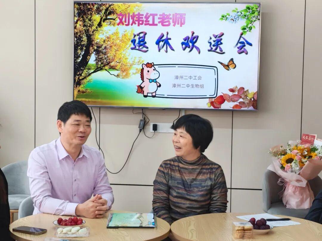 漳州二中(闽南师大附中)举行退休教师欢送会,校长林东兴对李艳华、刘炜红两位老师为学校教育事业发展、为学生身心发展所作出的卓越贡献表示敬意。体育教研组和生物教研组的老师们畅所欲言,赞颂师者大爱,表达不舍之情。