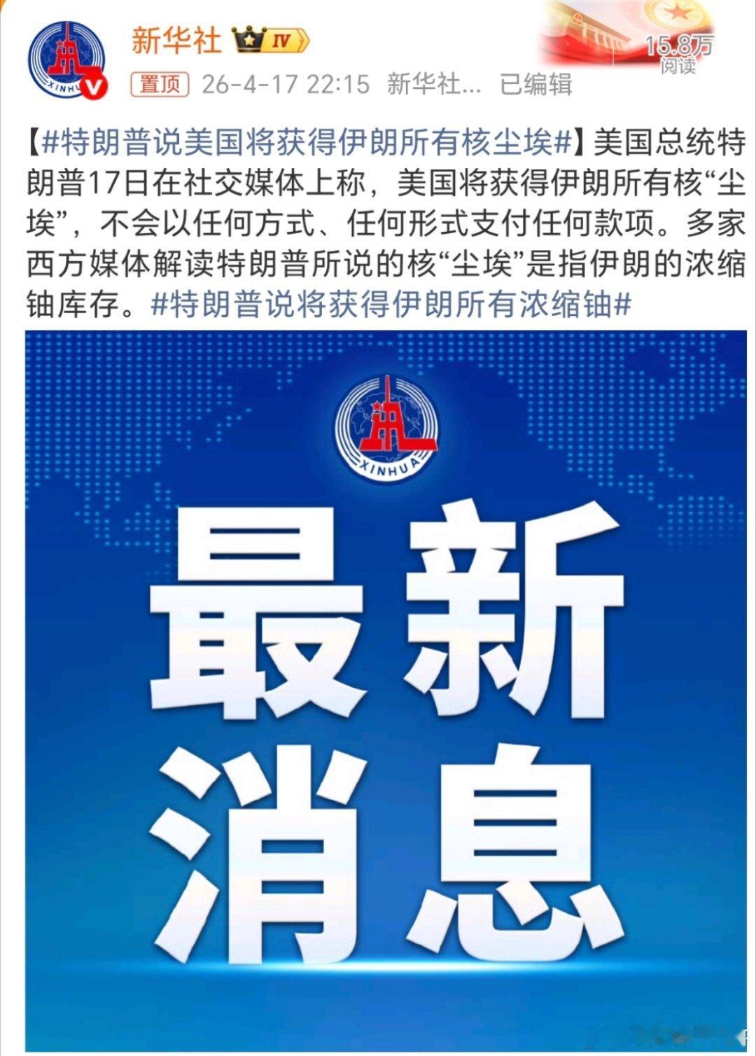 特朗普说美国将获得伊朗所有核尘埃啥意思?是谈出来的结果呢?还是说就你特朗普口嗨出
