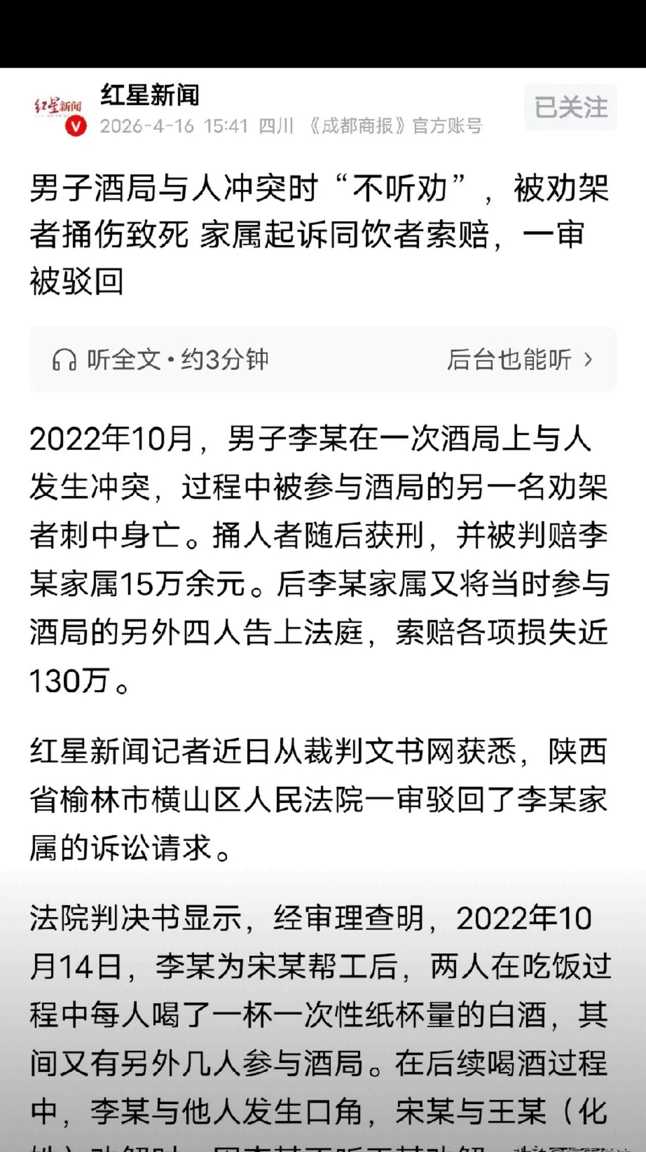 活久见!”陕西榆林,男子给朋友帮工,酒局期间和他人发生口角,其中一酒友劝架,男子不听,酒友拿出刀吓唬他,让他听话,却误将男子捅死,之后,酒友被判刑,赔偿家属15万多,谁料,家属转头又把东道主朋友和其他同饮者告上法院,索赔130万,法院判决令人叫好。 事情起因再简单不过:男子李某帮朋友宋某干完活,两人约着喝酒小聚,后来又有几个朋友凑局,本来是轻松的朋友局,结果喝出了人命。 喝到一半,李某不知为啥和旁人吵得面红耳赤,越闹越凶,在场的人纷纷上前拉架劝和,可李某正在气头上,谁劝都不听,还把劝架的王某怼得下不来台。 王某一时脑热,跑去车里拿了把刀,本意就是想吓唬李某,让他别再胡闹,结果失手直接捅伤了李某,人当场就没了。 事发后,伤人者王某罪责难逃,被判刑还赔偿了死者家属15万多,该承担的主要责任一点没跑。 本以为这事到此为止,没想到家属竟嫌赔偿太少,转头就把酒局东道主和其他同桌喝酒的人,一股脑全告上法院,张口就要130万赔偿! 家属的逻辑更是让人无语:东道主组局就该全权负责,同饮者没拦住出事,全都有责任,都得赔钱! 这事一发酵,网友直接炸锅,评论区一边倒: ✅网友“平凡老杨”:纯纯讹人!人家又没劝酒,还主动拉架了,难不成还要预判别人会拿刀?太不讲理了! ✅网友“小桃生活记”:现在一出事就怪同桌,仗着死者家属漫天要价,这歪风该管管了! ✅网友“律法小讲堂”:明明是突发刑事犯罪,跟同桌饮酒没关系,凭啥让无辜的人买单? ✅网友“西北阿强”:还好法院明事理,不然以后谁还敢跟朋友喝酒、谁还敢劝架? 我的看法:必须给这个法院点赞!彻底掰正了“酒局出事同桌全担责”的误区! 法律从来不是“和稀泥”,根据《民法典》规定,只有同饮者存在强行劝酒、灌酒,或是对醉酒者未尽到基本照顾义务,才需要承担责任。 本案里,所有同桌人既没劝酒,也第一时间拉架制止冲突,王某持刀伤人是突发的极端刑事犯罪,这是任何普通人都无法提前预见、也没法瞬间制止的,东道主和其他酒友根本无任何过错! 就该这么判!坚决不纵容“闹就有钱赔”的不良风气,法律讲的是过错,从来不是谁弱谁有理、谁闹谁占便宜! 最后也提醒大家:喝酒千万别冲动上头,遇事冷静别较劲,一时意气真的会毁了两个家庭! 大家觉得法院判得对吗?换做是你,遇到这种事还敢劝架吗?👇
