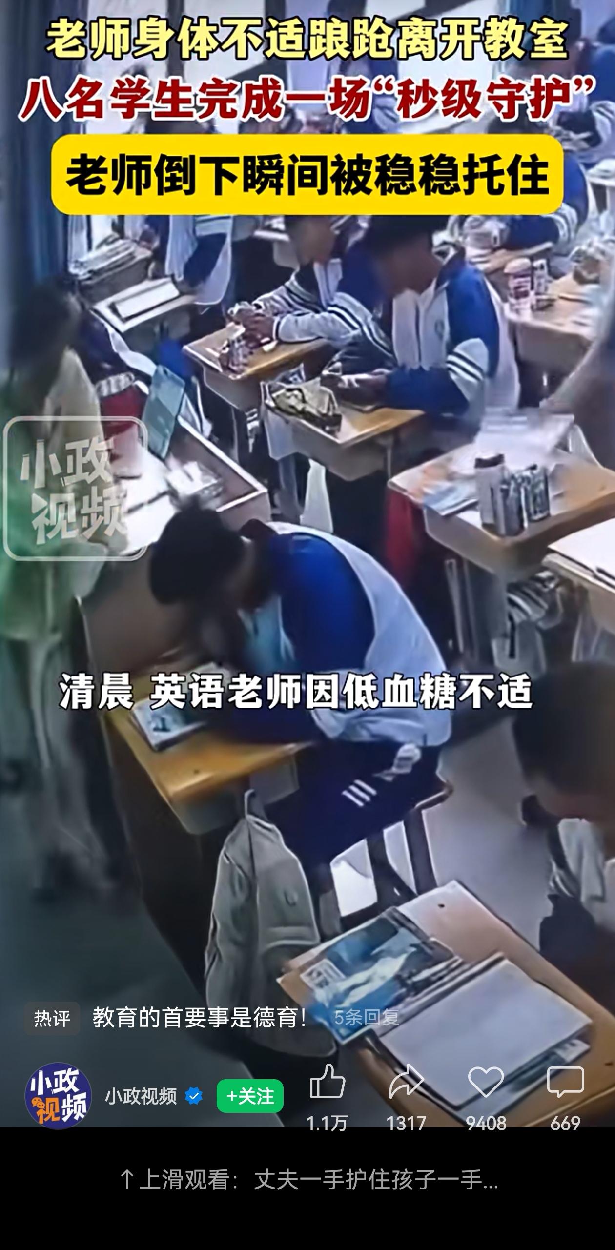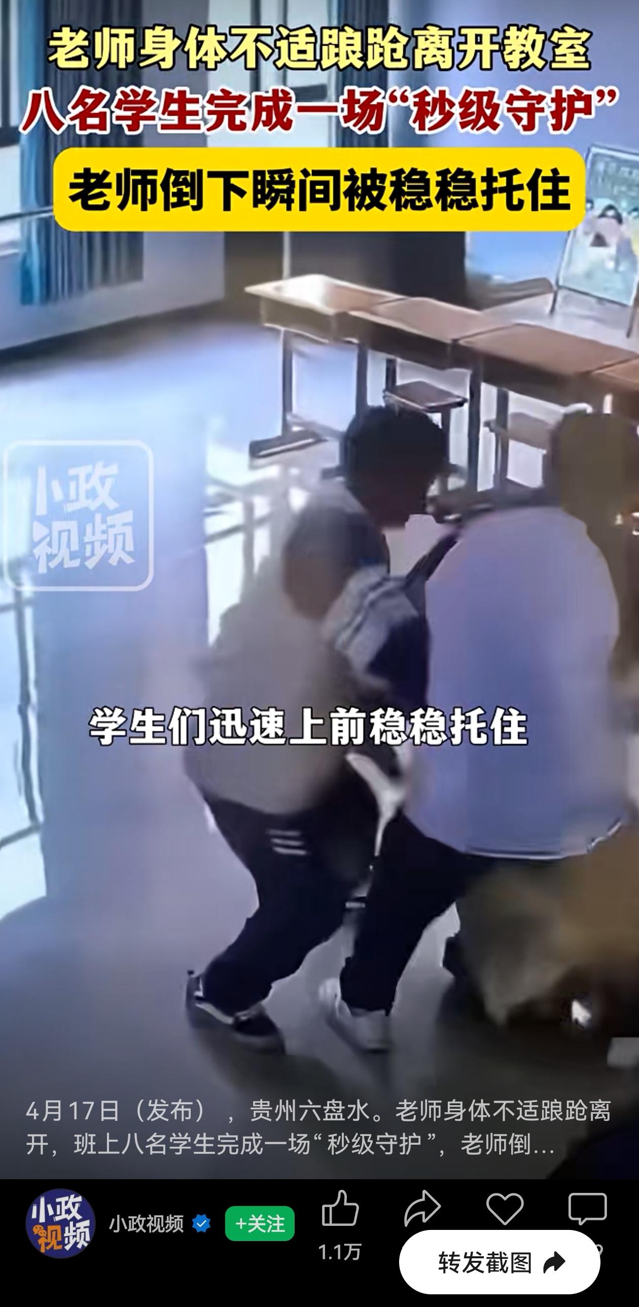 暖心的“00后”们!2026年4月16日早上,贵州六盘水青云学校,高二(6)班的英语老师因为没吃早餐,突然低血糖发作,头晕得厉害。 她怕吓着学生,慢慢地硬撑着走出教室,想去隔壁缓一缓。 老师的异样没逃过学生的眼睛,前排的8个学生悄悄地跟随着老师出了教室,观察着老师…… 看到老师还没有走到隔壁班教室门口,撑不住马上就要摔倒时,8个学生几乎同时冲出去,从四周稳稳把老师稳稳托住! 老师很快没事了。下午她去别的班上课,讲台上堆满了小面包和零食,“老师,要好好吃饭。” 这群学生实在让人又暖又感慨!现在老有人说“00后冷漠”“孩子越来越自私”,可这8个孩子用行动证明了,“00后”哪里冷漠? “六盘水青云学校”,虽然只是一所民办学校,非省级示范高中,但是孩子们一样的观察敏锐、太有心了。 更难得的是,不慌不乱,不张扬,悄悄跟在身后,关键时刻一起伸手,稳稳托住,这是孩子们善良的本能,更是教养。 网友们说得好:“教育的首要事是德育!” “这才是双向奔赴的师生情” “少年有担当,温暖又治愈” 可见老师用心对待学生,学生才会在老师需要时,本能地回馈爱。这份彼此体谅、互相守护,是不是比任何说教都动人吗? 校方要在升旗仪式上表彰这8个孩子,确实应该狠狠表扬!有心的孩子,闪闪发光的孩子,难道不是最好的教育成果吗? 善良不是装出来的,是刻在好孩子骨子里的。这样的孩子,真的值得使劲表扬! 信息来源:小政视频