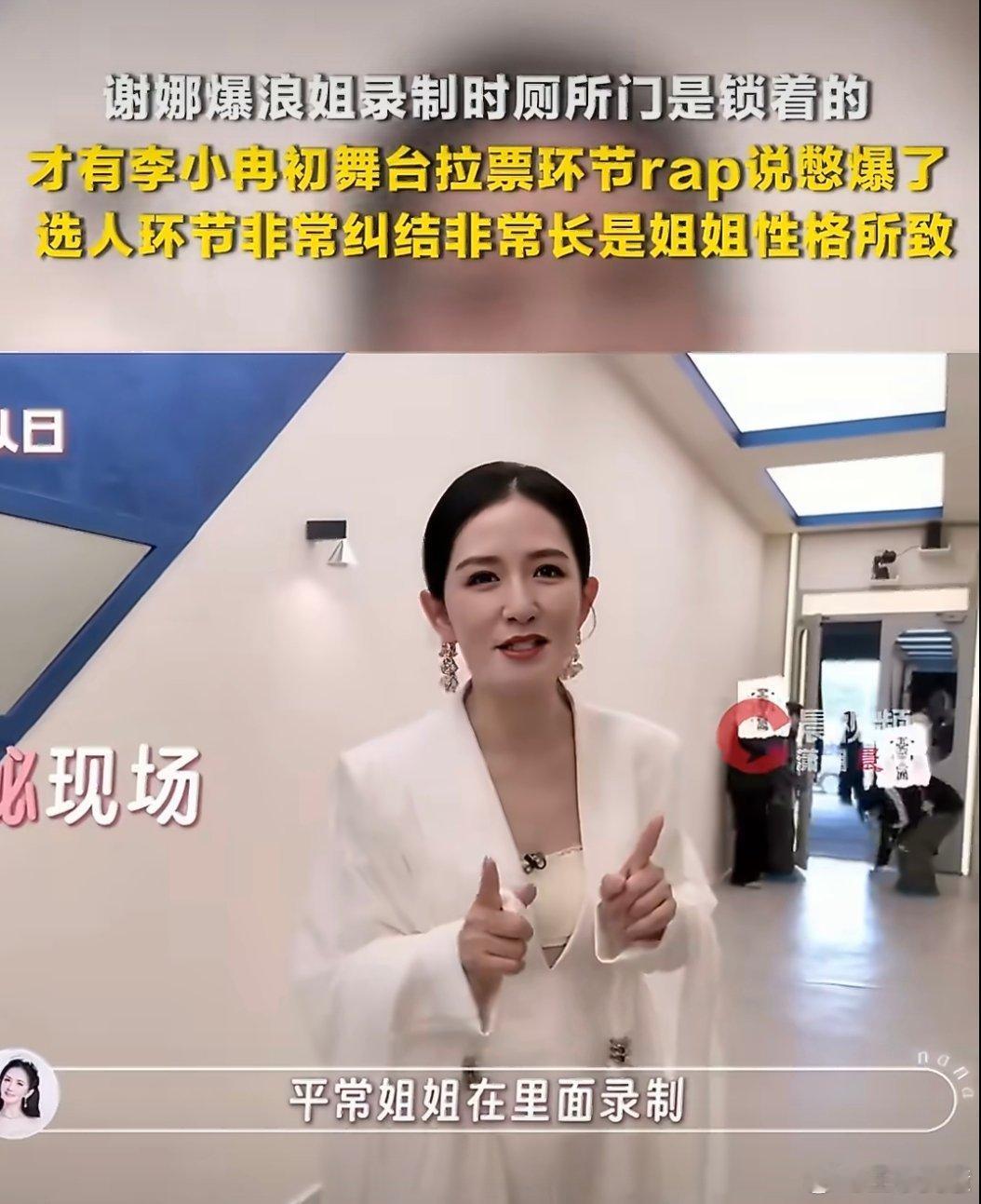谢娜爆料浪姐录制时厕所门是锁的谢娜在4月17日发布的vlog中提到,节目录制期间厕所门全程锁闭,姐姐们只能在休息间隙或特定时段如厕。这一安排导致李小冉在初舞台拉票环节即兴创作了"姐姐都要憋爆了"的rap歌词,我就想不通了,为什么要把厕所门给锁着?本来演出就已经很辛苦了,居然还不让上厕所