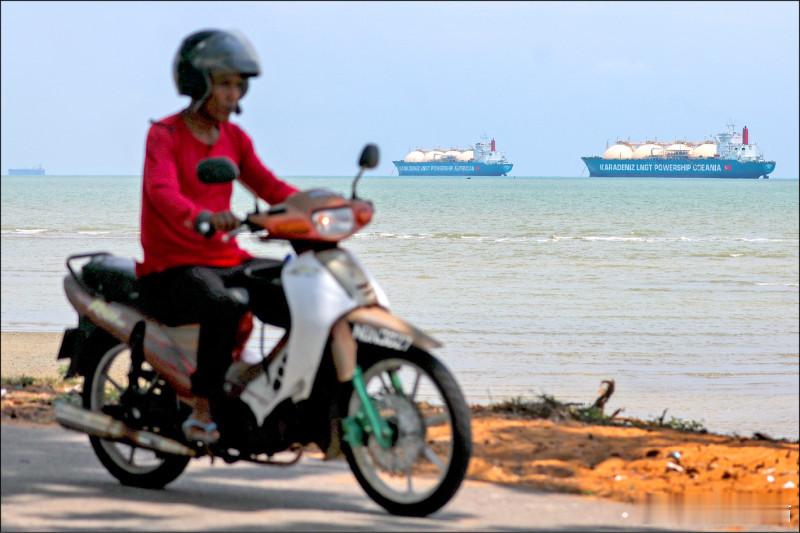 图:停泊在马来西亚马六甲海峡的液化天然气载运船。 (欧新社)